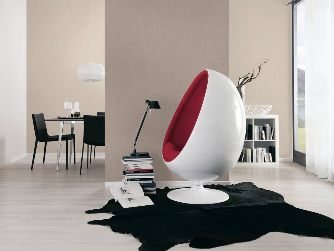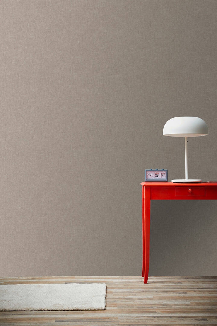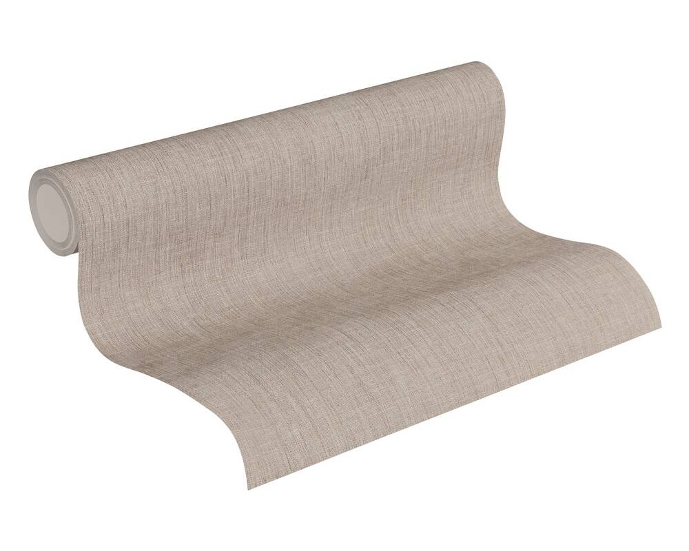 Faktura tapety delikatnie tłoczona, chropowata w dotyku, przypomina splot tkaninowy. Kolor niejednolity, różne odcienie beżu i brązu przeplatają się ze sobą tworząc doskonałą imitację tkaniny. Naturalna i prosta aranżacja ociepli nasze ściany i stanie się doskonałym tłem dla wzorzystych tapet z tej kolekcji.