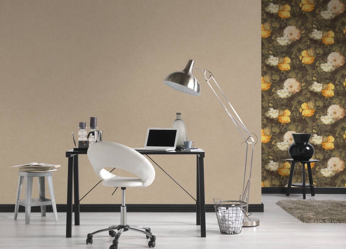 Tapeta o ciekawej kolorystyce i interesującej teksturze, znajdzie uznanie u wszystkich, którzy lubią i cenią sobie proste, uniwersalne i nowoczesne rozwiązania w aranżacji swoich wnętrz. Faktura tapety delikatnie tłoczona, chropowata w dotyku, przypomina splot tkaninowy. Kolor niejednolity, różne odcienie brązu i beżu przeplatają się ze sobą tworząc doskonałą imitację tkaniny. Naturalna i prosta aranżacja ociepli nasze ściany i stanie się doskonałym tłem dla wzorzystych tapet z tej kolekcji.