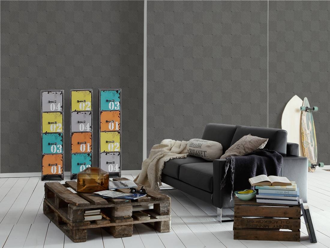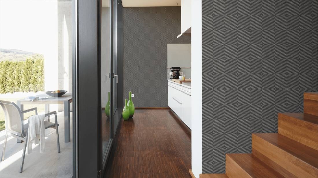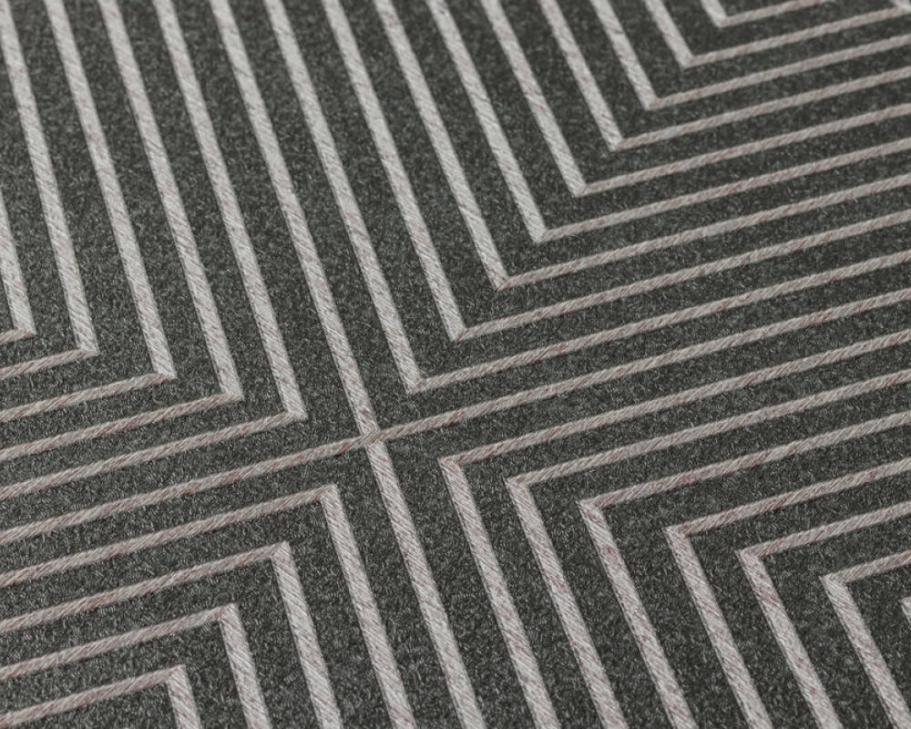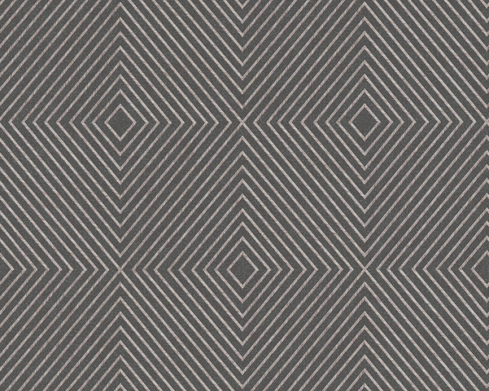 Tapeta o ciekawym wzorze i interesującej teksturze, znajdzie uznanie u wszystkich, którzy lubią i cenią sobie proste, uniwersalne i nowoczesne rozwiązania w aranżacji swoich wnętrz. Faktura tapety lekko chropowata/szorstka w dotyku. Tło w odcieniu ciemnej szarości/antracytu, na nim gęsto ułożone romby umieszczone w regularnym porządku od najmniejszego do największego, tworzą kwadratowe formy. Kontury wzoru ok 0,5 cm szerokie o jaśniejszym kolorze, prążkowanej fakturze i srebrnej-lekko połyskującej poświacie, tworzą nowoczesną i reprezentacyjną kompozycję ścienną.