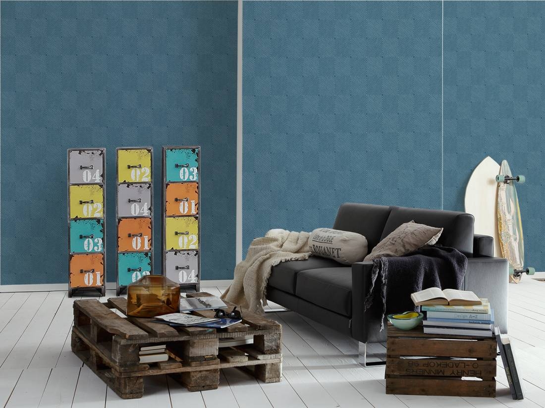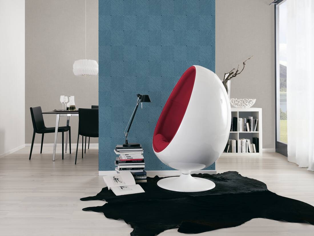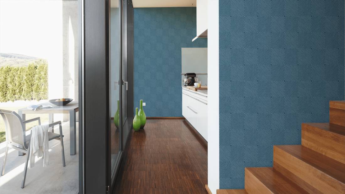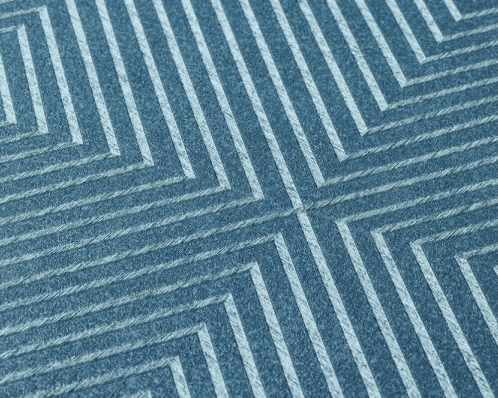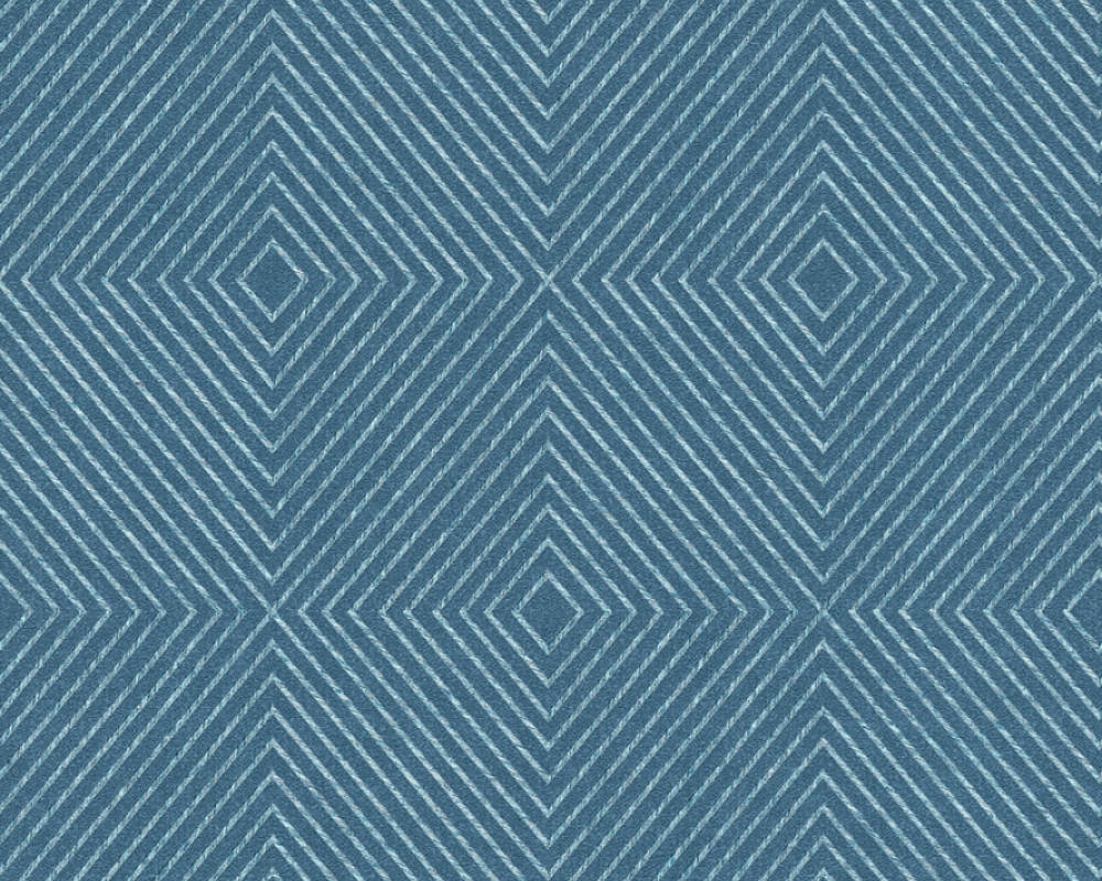 Tapeta o ciekawym wzorze i interesującej teksturze, znajdzie uznanie u wszystkich, którzy lubią i cenią sobie proste, uniwersalne i nowoczesne rozwiązania w aranżacji swoich wnętrz. Faktura tapety lekko chropowata/szorstka w dotyku. Tło w odcieniu niebieskiego, na nim gęsto ułożone romby umieszczone w regularnym porządku od najmniejszego do największego, tworzą kwadratowe formy. Kontury wzoru ok 0,5 cm szerokie o nieco jaśniejszym odcieniu, prążkowanej fakturze i srebrnej-lekko połyskującej poświacie, na ciemniejszym tle tworzą nowoczesną i reprezentacyjną kompozycję ścienną.