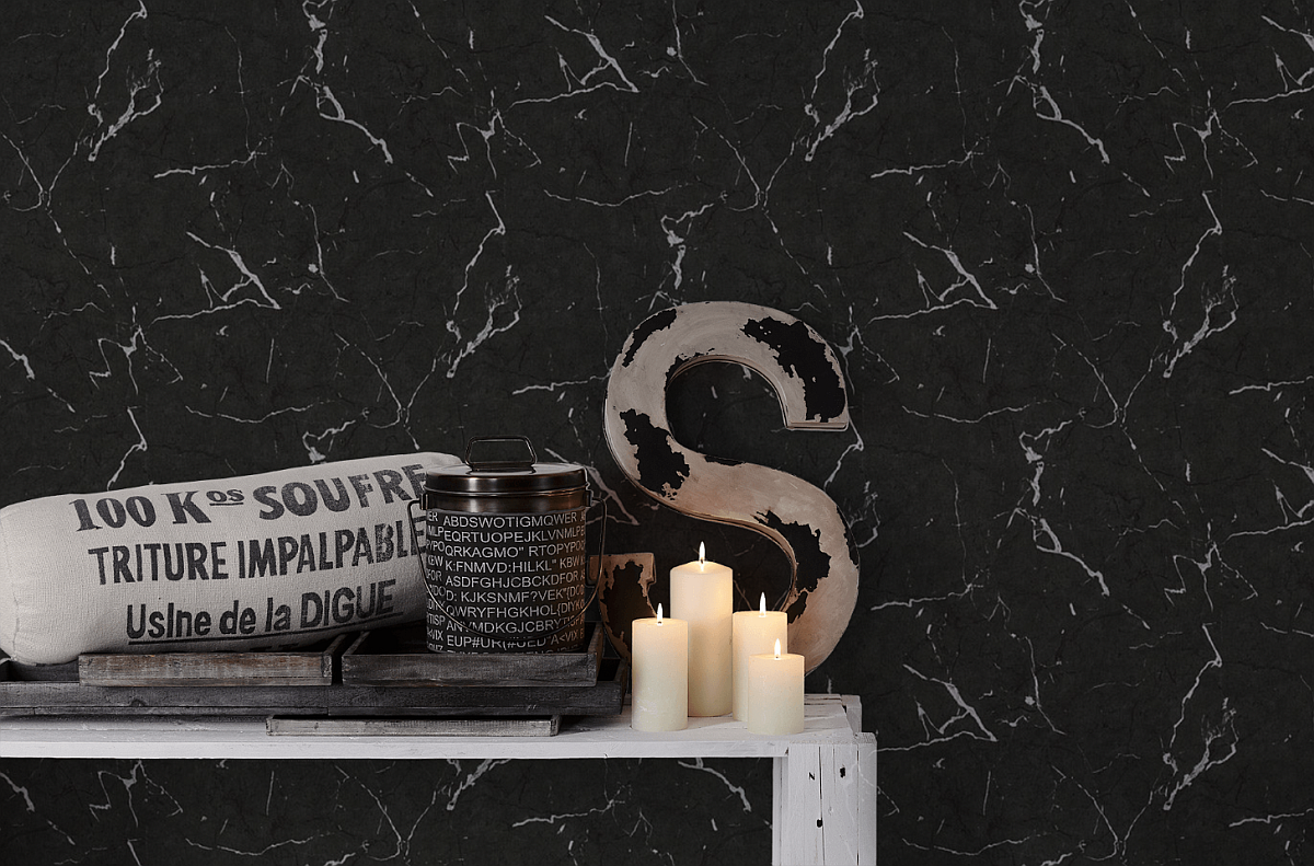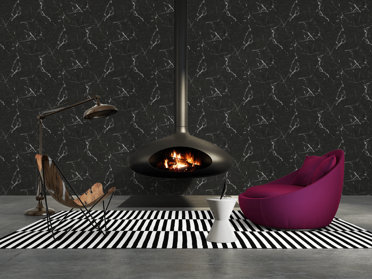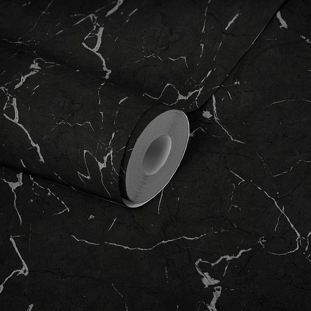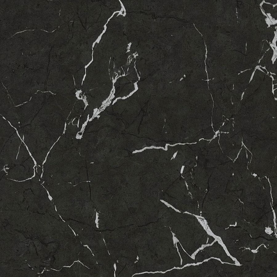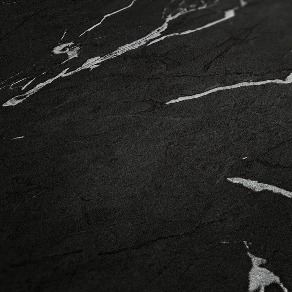 Tapeta ścienna na flizelinie w realistyczny wzór marmuru w kolorze metalicznej czerni ze srebrnymi i czarnymi żyłkami.