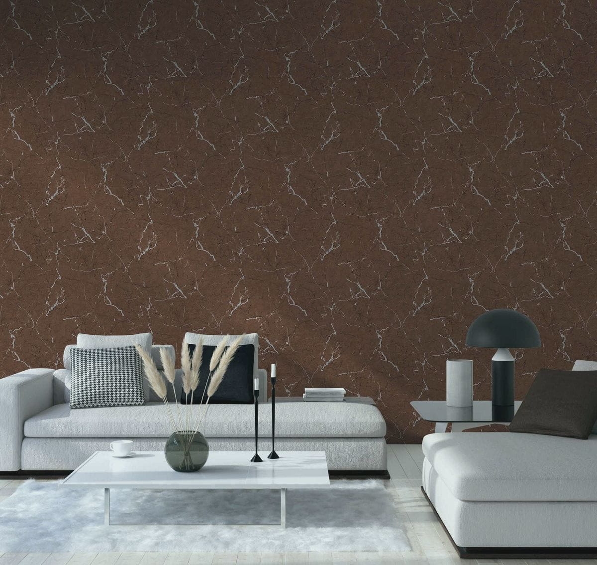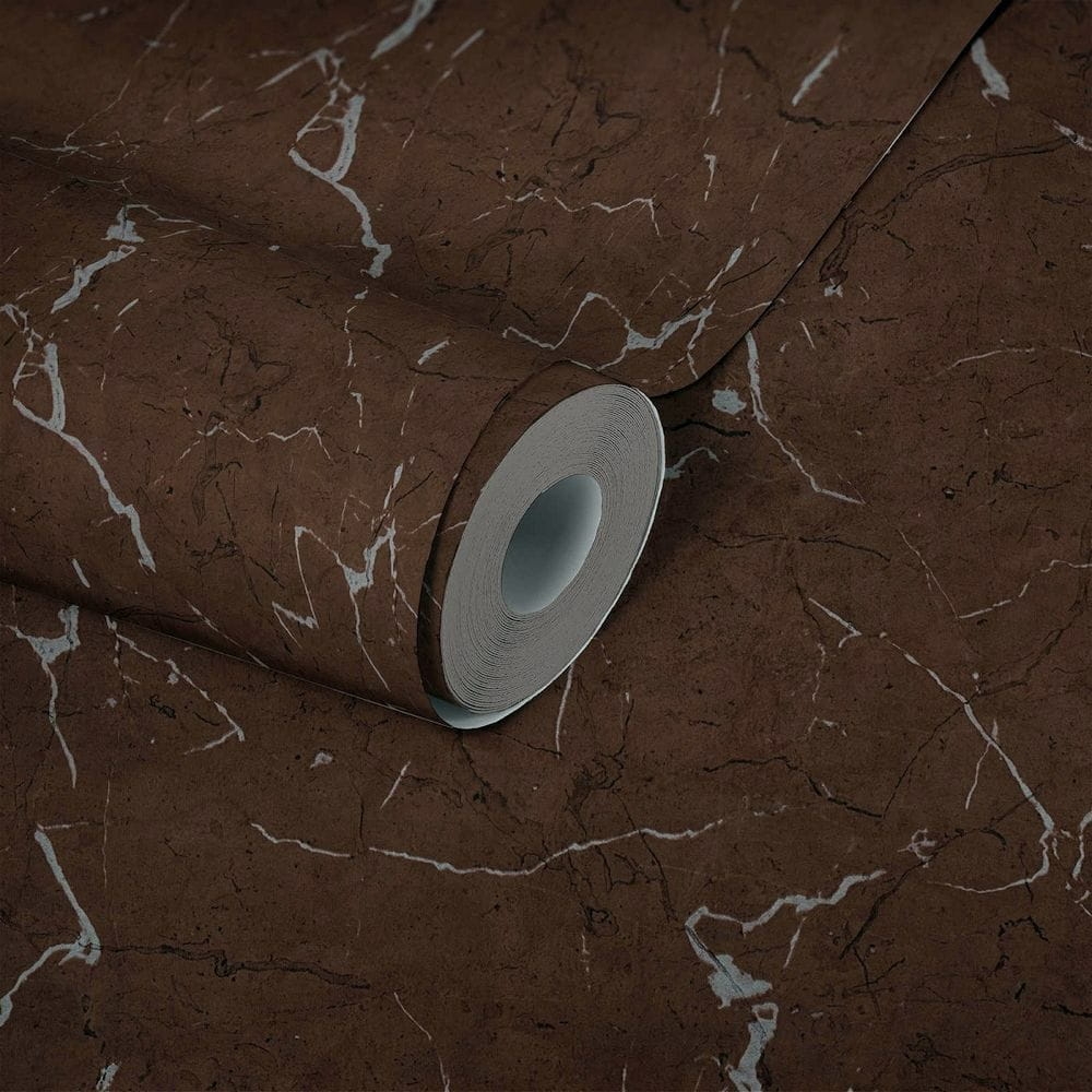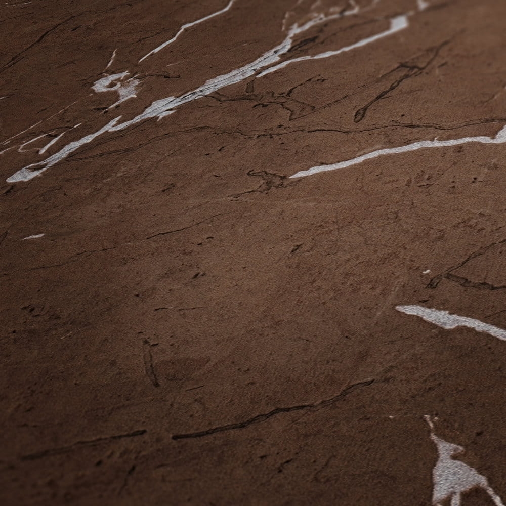Tapeta ścienna na flizelinie w realistyczny wzór marmuru w kolorze orzechowego brązu ze srebrnymi i czarnymi żyłkami charakterystycznymi dla marmuru.