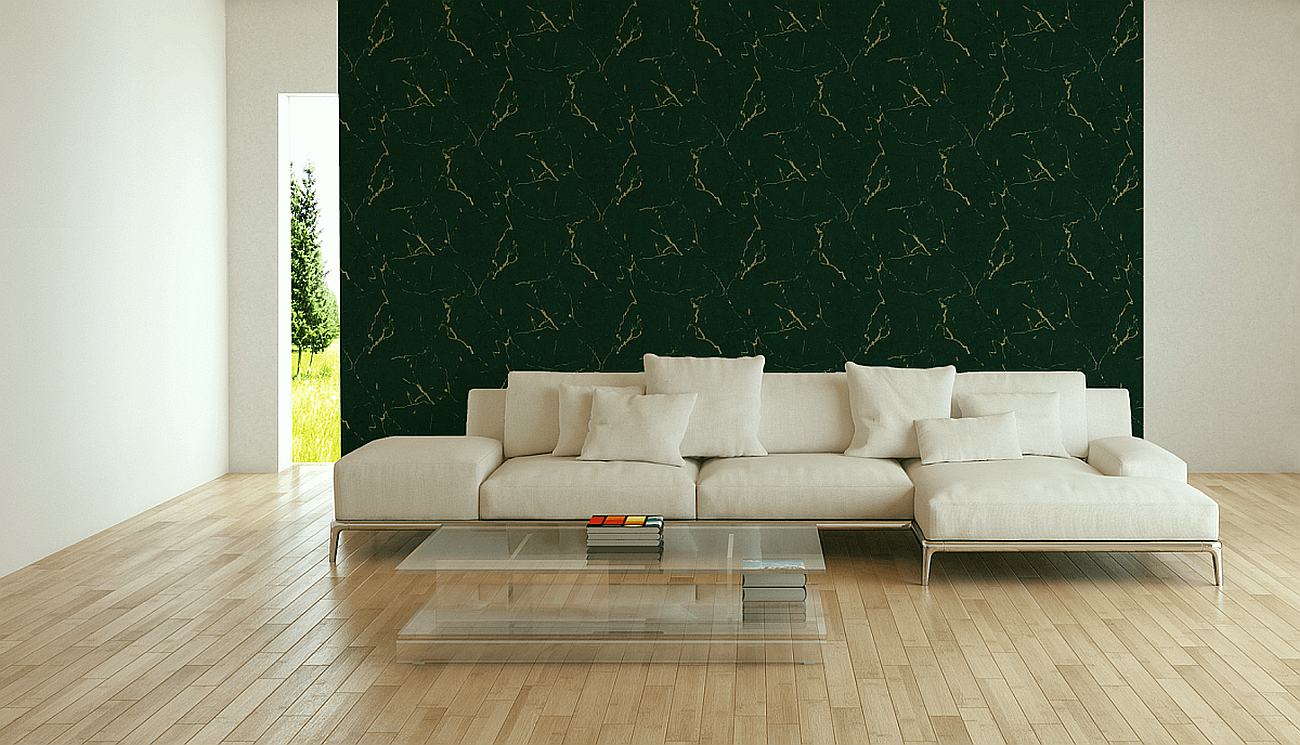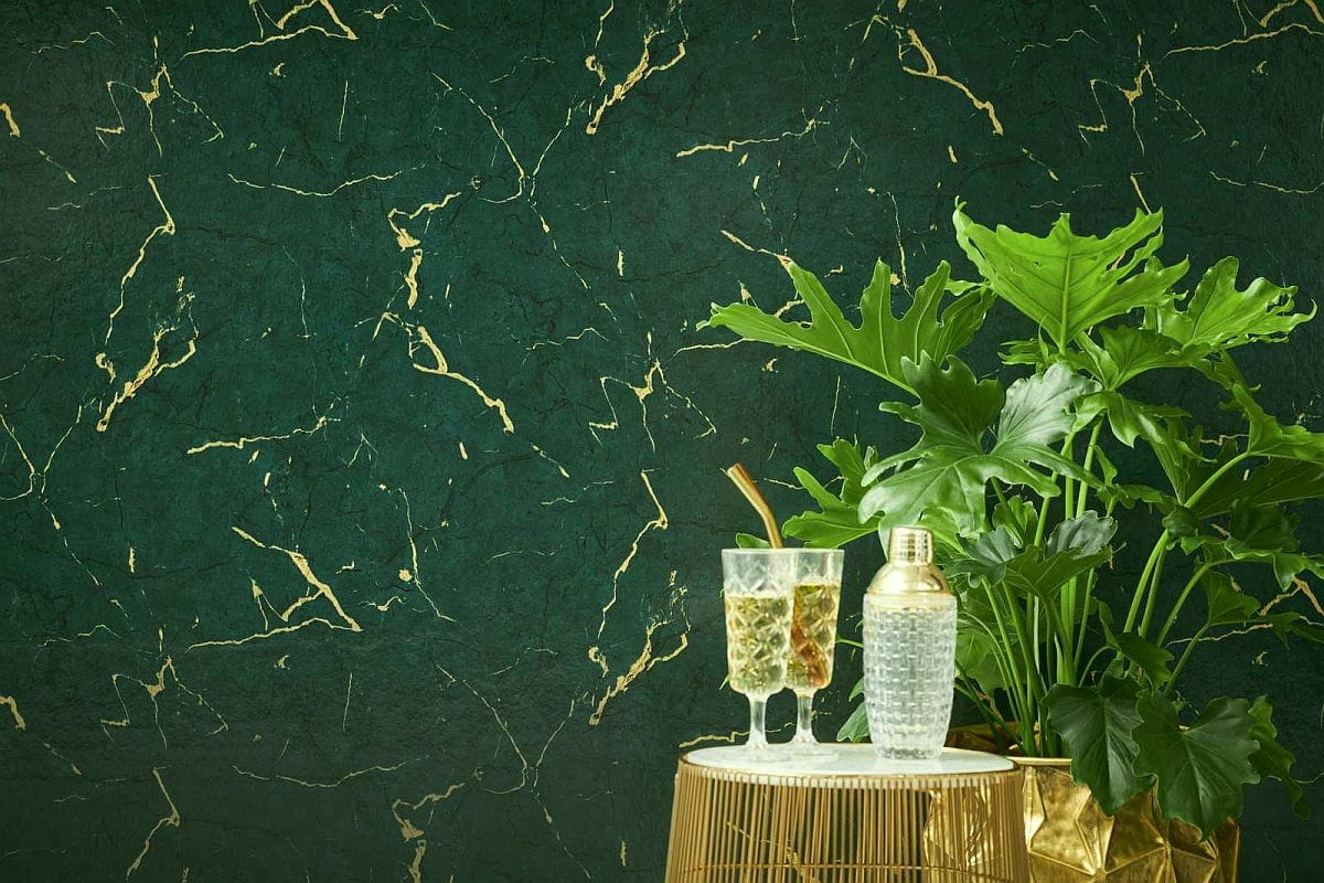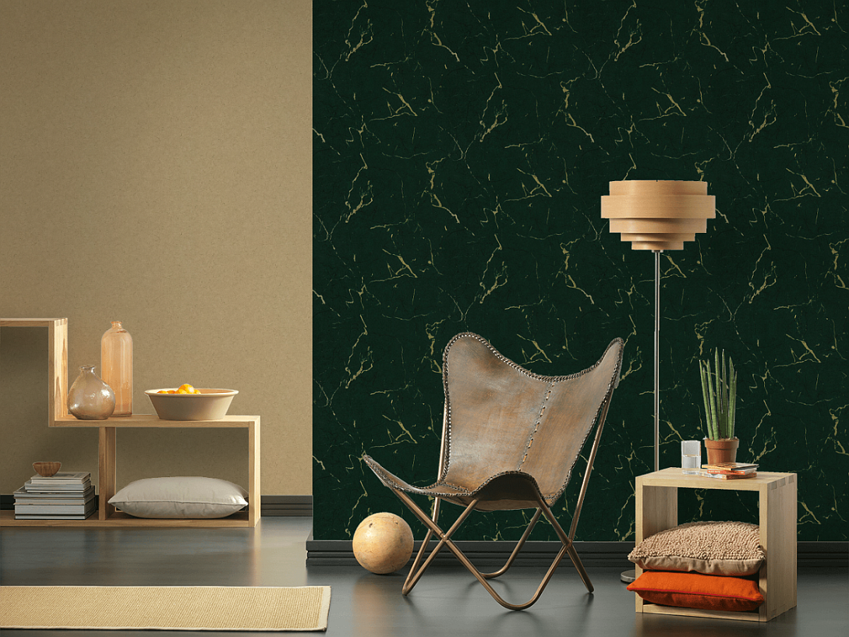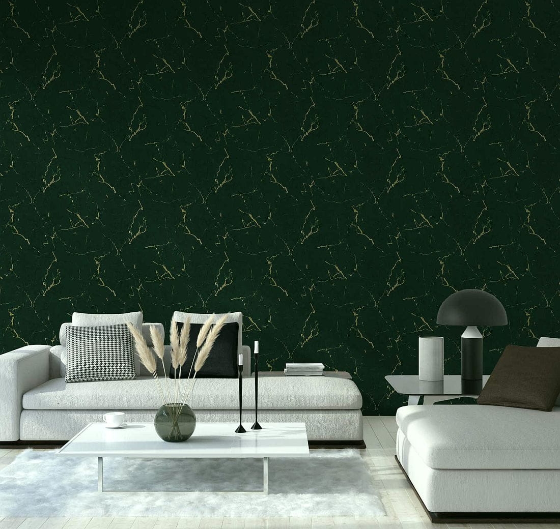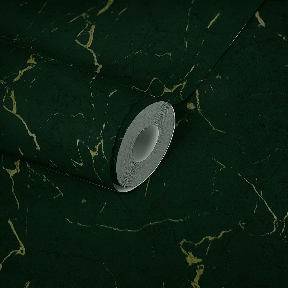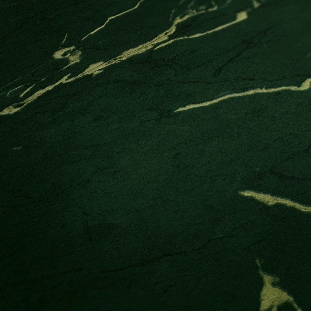Tapeta ścienna na flizelinie w realistyczny wzór marmuru w kolorze butelkowej zieleni z beżowymi i ciemniejszymi żyłkami.