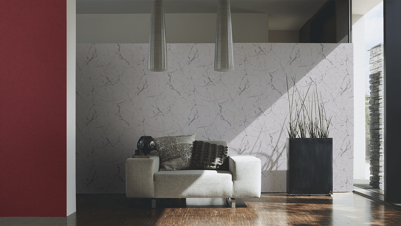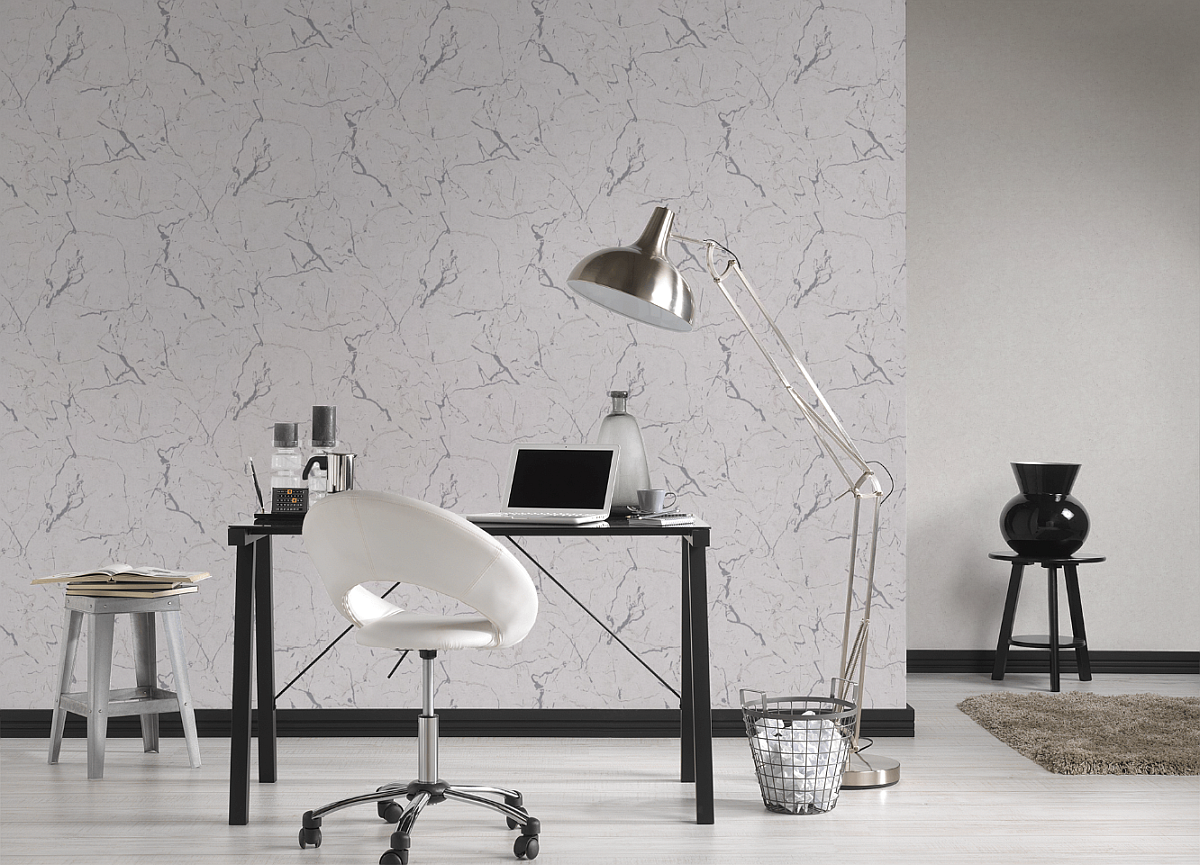 Tapeta ścienna jednolita, imitująca marmur prezentuje się dobrze zarówno w pomieszczeniach, w których spędza się większość wolnego czasu - jak salon i sypialnia, ale również w przedpokoju, czy kuchni. Wzór jest nowoczesny, prosty i na tyle elastyczny, że na pewno sprawdzi się wszędzie, gdzie tylko go potrzebujesz.