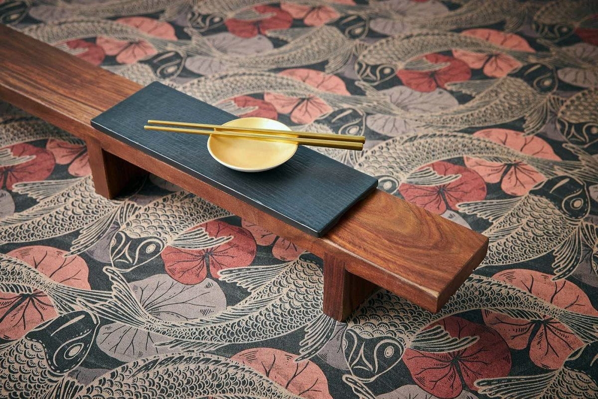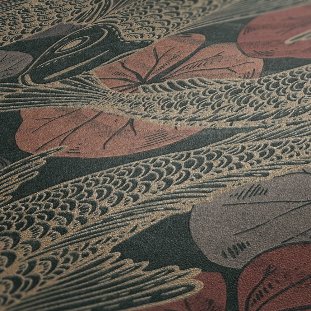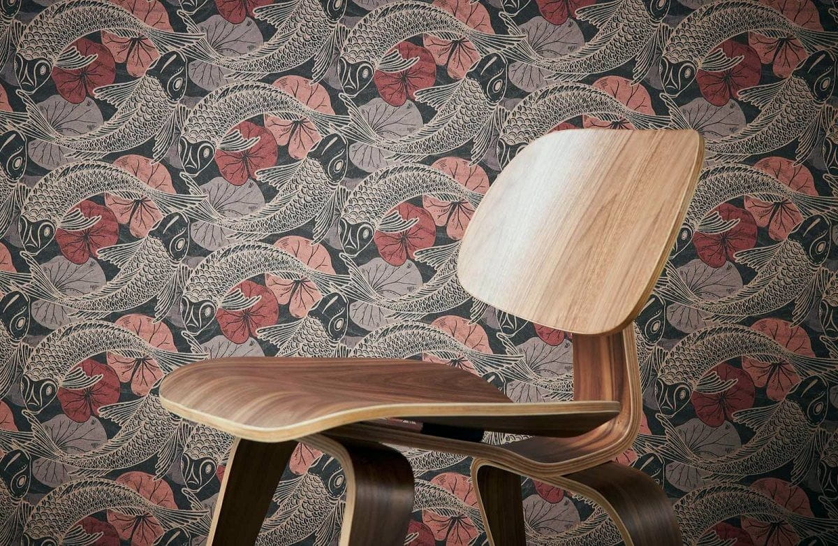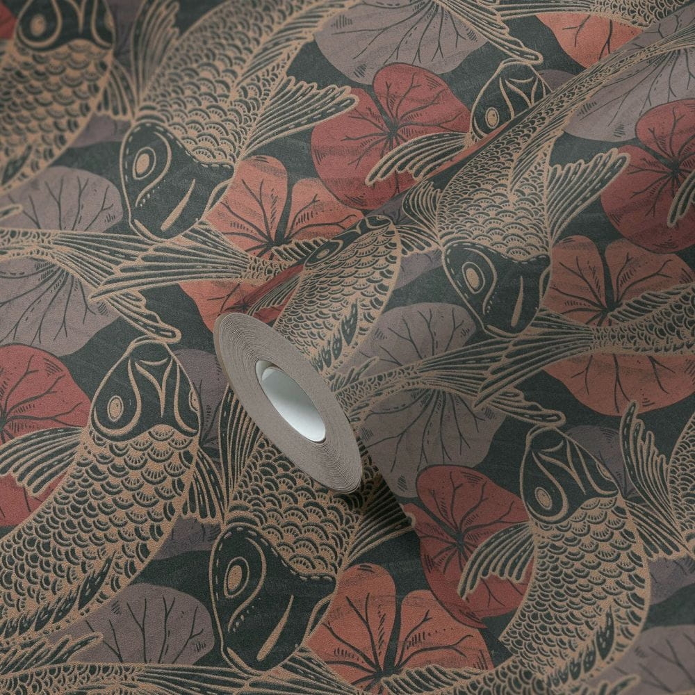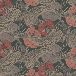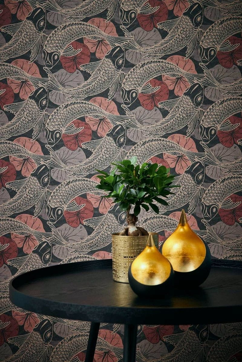 Rybki Koi, które w kulturze japońskiej symbolizują szczęście, są najnowszym motywem w kolekcji tapet AS Creation. Na czarnym, matowym tle umieszczony jest błyszczący wzór, w różnych odcieniach koralowego i bordowego koloru.