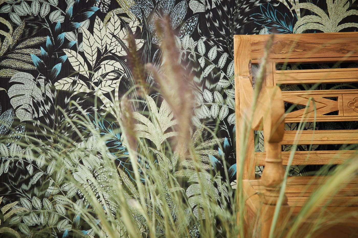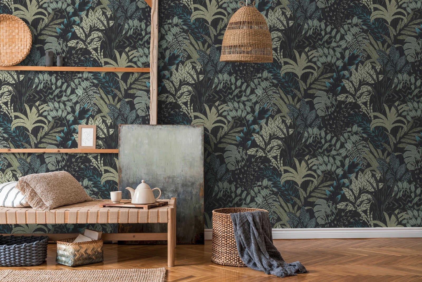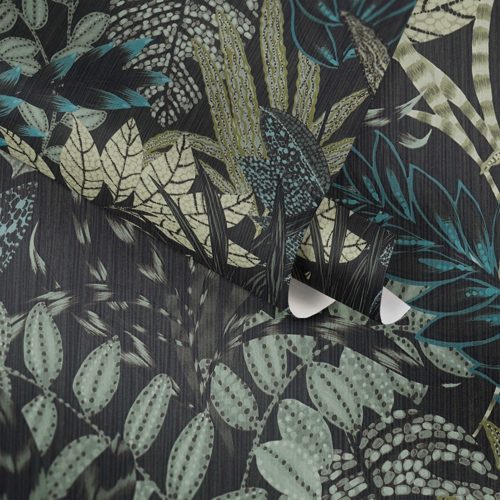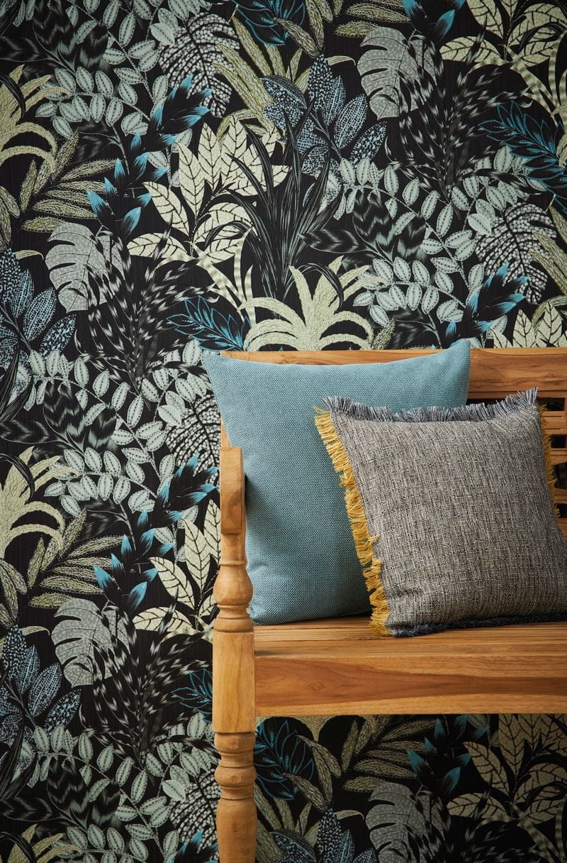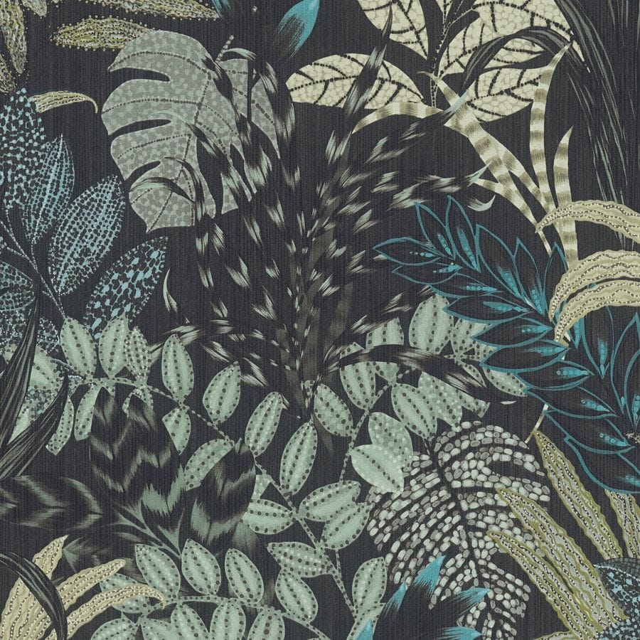Tło tapety w głębokiej czarnej barwie oraz liście podkreślone za pomocą różnych graficznych wzorów to charakterystyczny rys okładzin ściennych w stylu afrykańskim najnowszej kolekcji tapet AS Creation. Dodatkowo turkusowe, szałwiowe i morskie kolory ożywiają wzór nadając mu charakterystycznego dla tej części świata nocnego afrykańskiego klimatu.