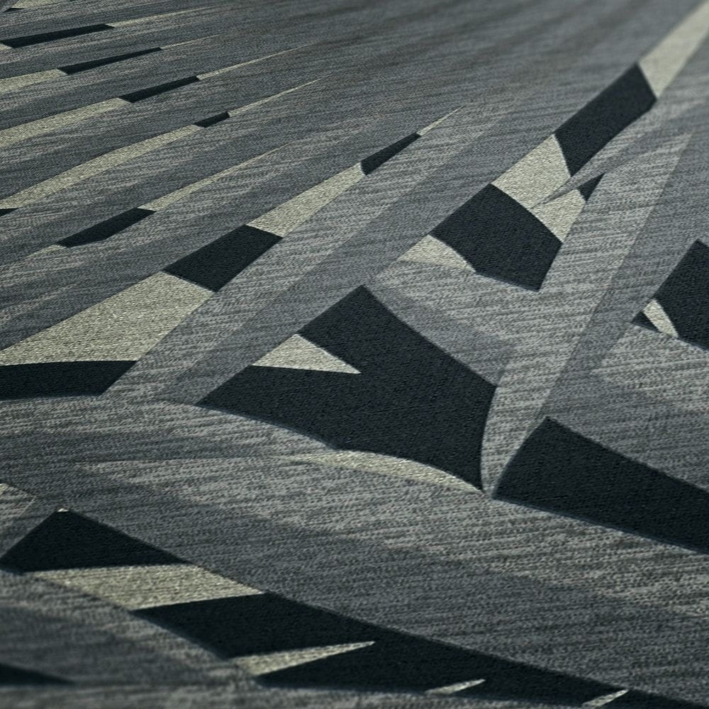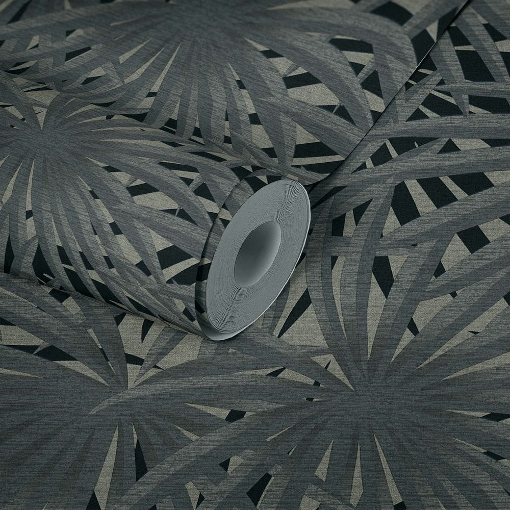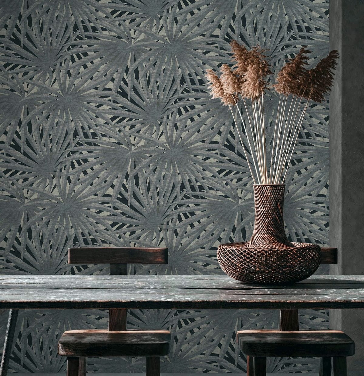 Tło tapety w odcieniu głębokiej czerni zaś liście w ciemnoszarym oraz w błyszczącym srebrnym kolorze.
