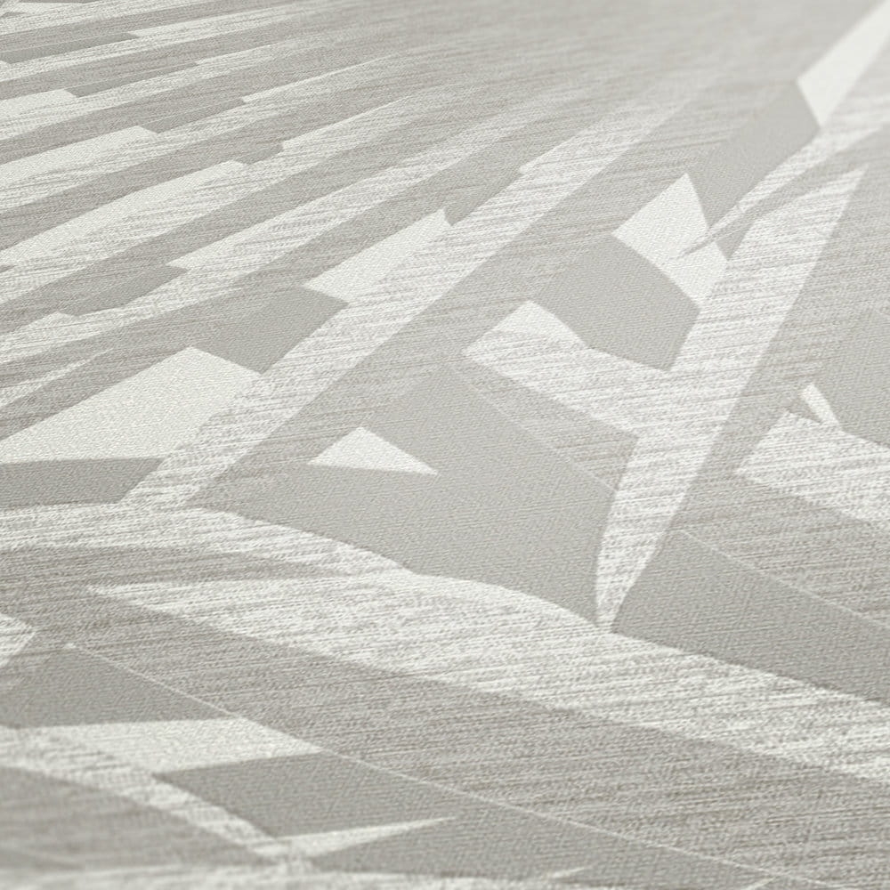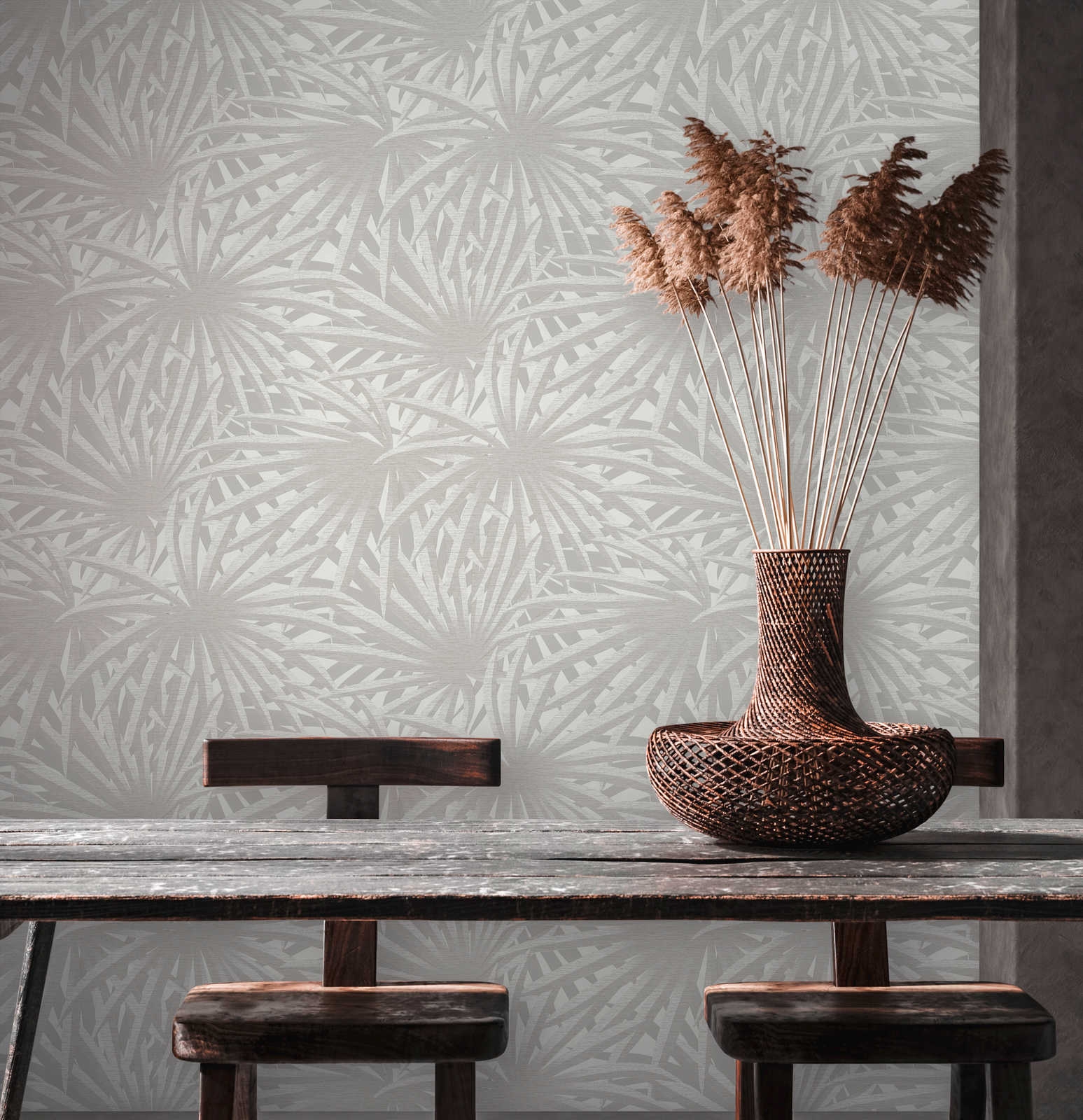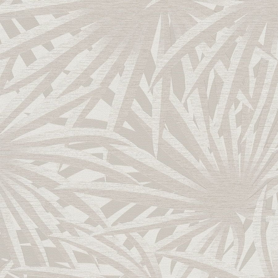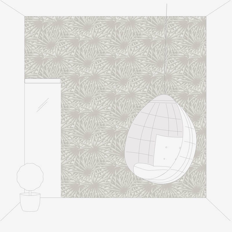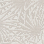 Liście palmy, matowe i w dwóch odcieniach jasnego beżu rozłożone są na jasnym tle tapety, które jest delikatnie pociągnięte bezbarwnym złotym lakierem, co daje w rezultacie subtelny odcień ecru, który odrobinę połyskuje pod wpływem padającego światła.