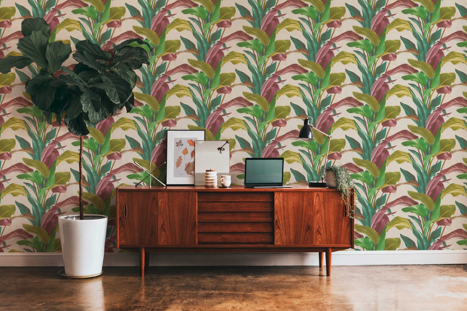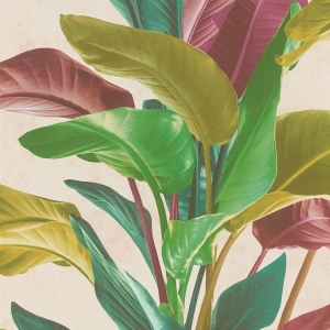 Tło tapety w odcieniu delikatnego cieniowanego beżu/ecru, wzór- duże liście w różnych odcieniach zieleni, złotego brązu, bordowego różu.