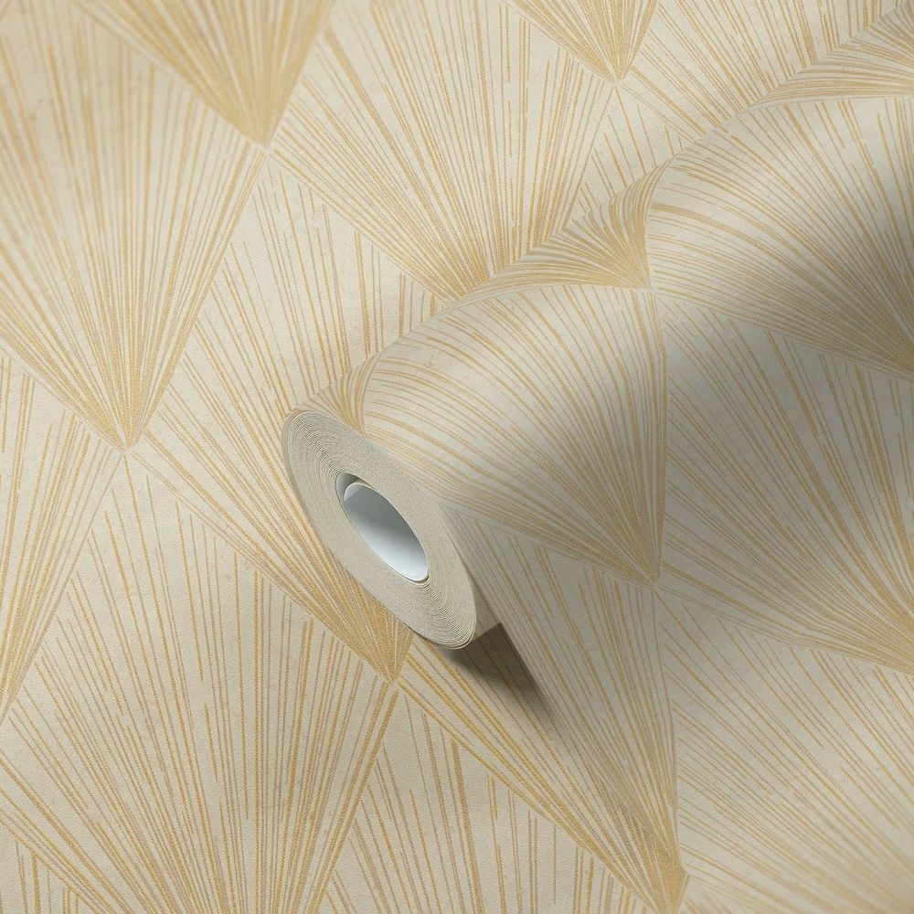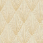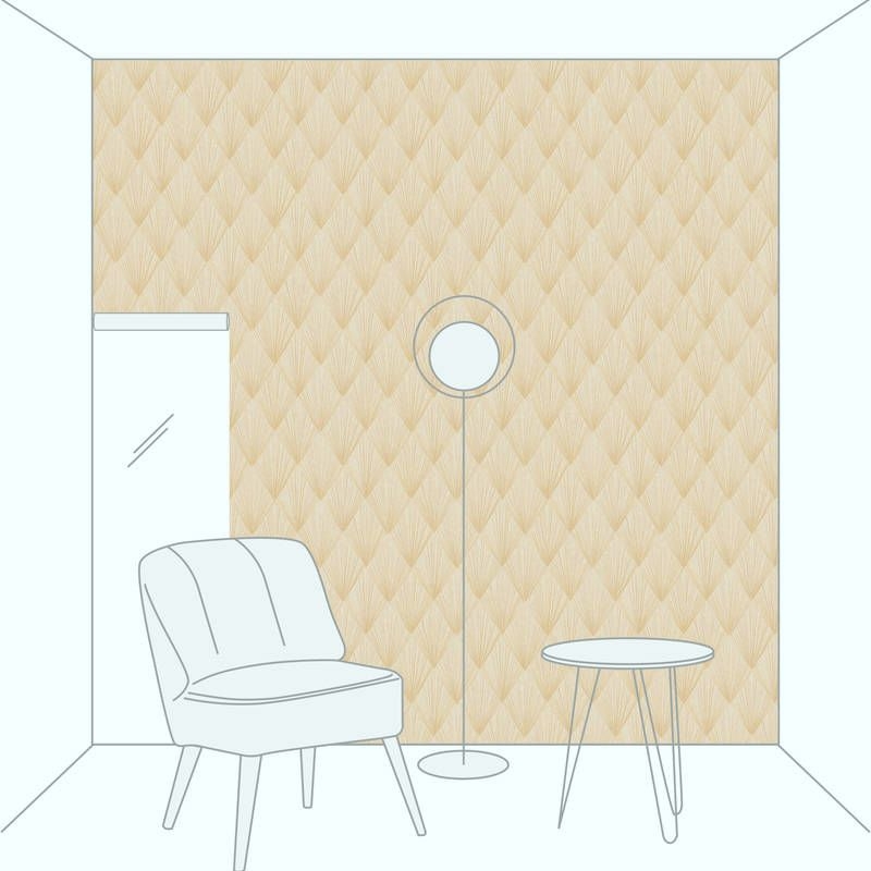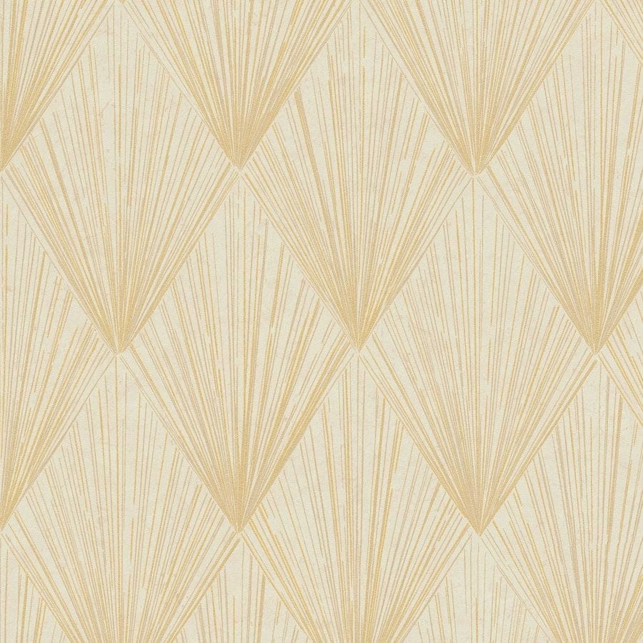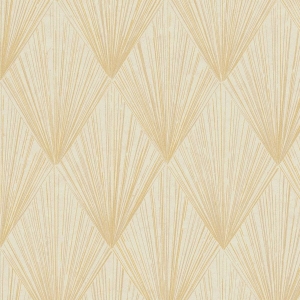 Tło tapety beżowe z marmurkowym wzorem. Na tym tle namalowane są, na przemian, ciemnobeżowe i złote kreski- linie rozchodzące się promieniście z jednego punktu, tworząc w rezultacie wzór geometryczny, romby, kwadraty.