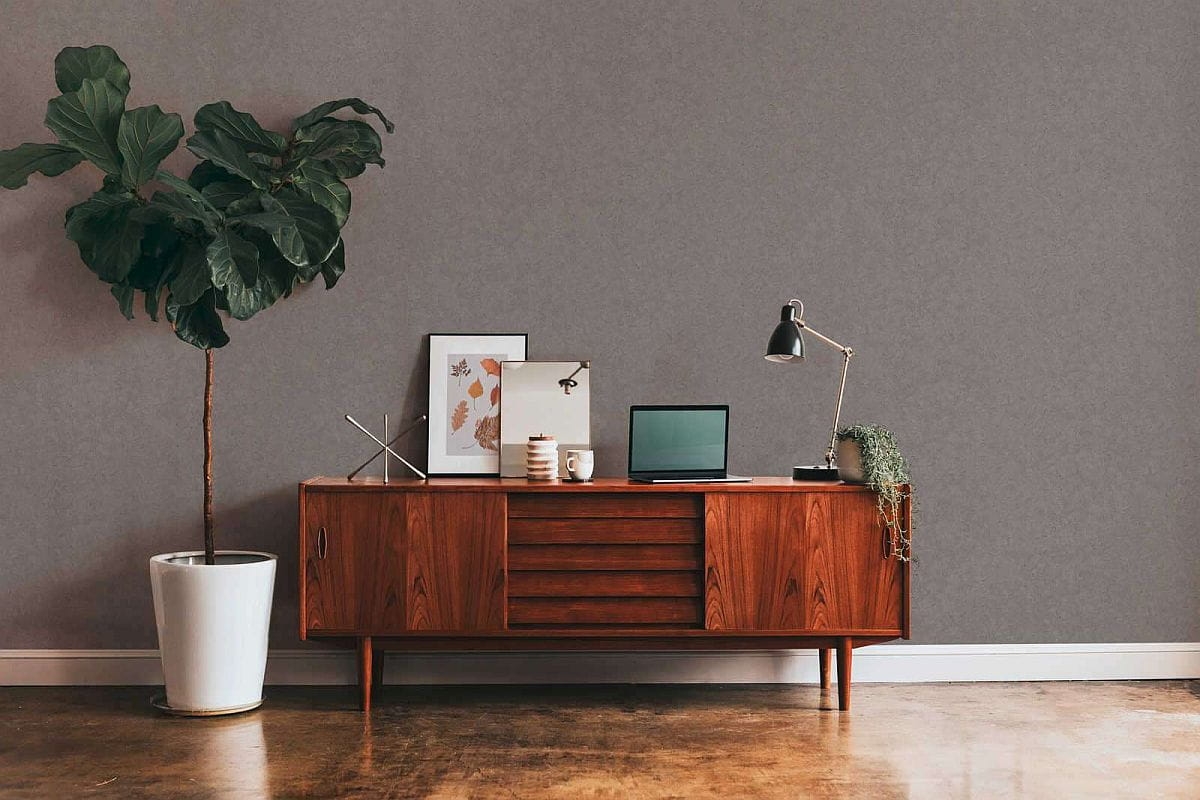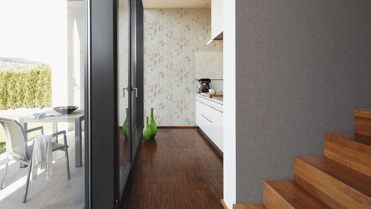 Tapeta występuje w odcieniu szarym z widocznymi ciemniejszymi żyłkami, plamkami charakterystycznymi dla tynku lub betonu.