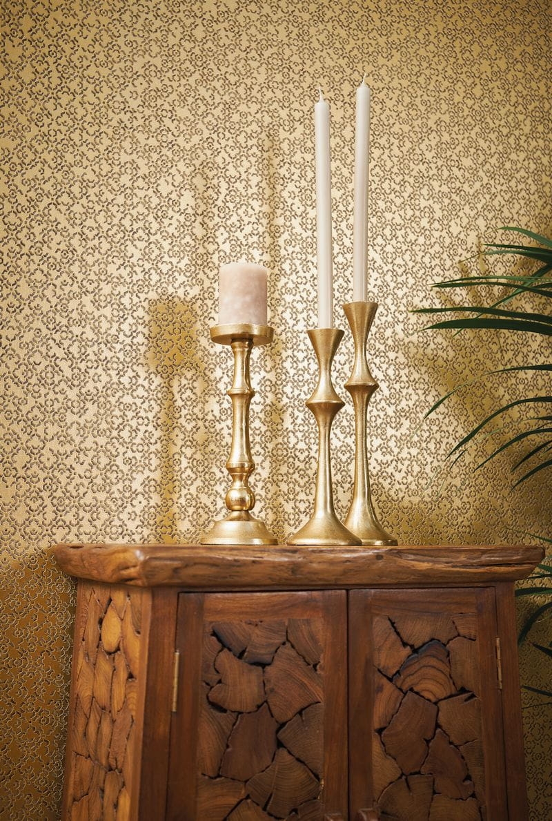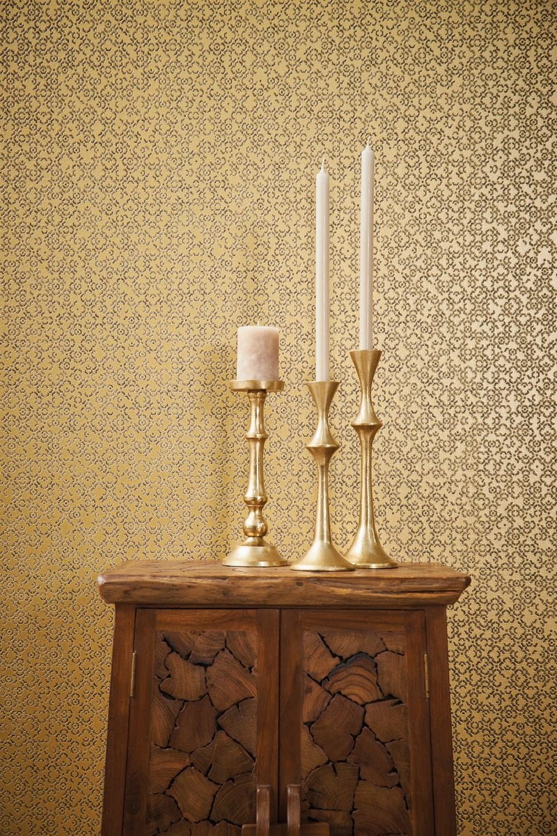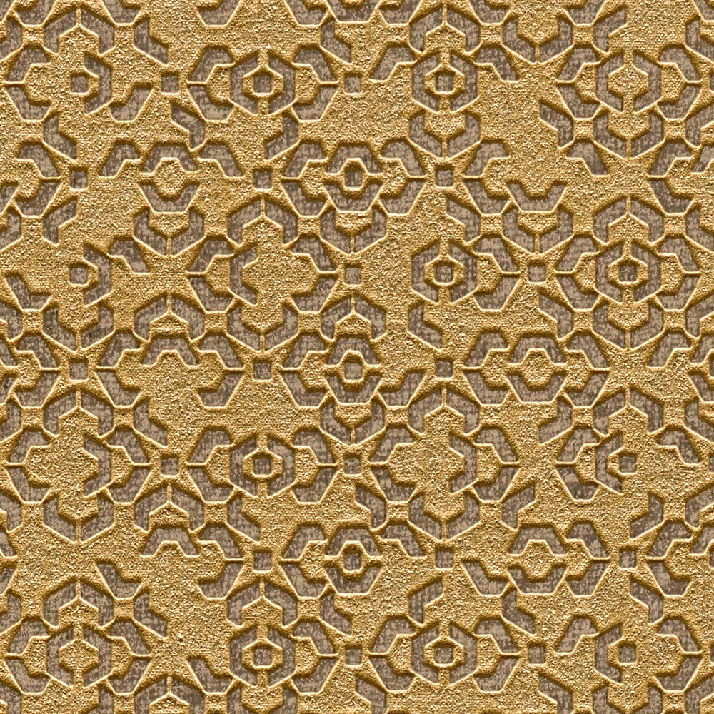 Wzór marokańskiej struktury został doskonale odzwierciedlony na winylowej tapecie ściennej na flizelinie w złotej kolorystyce