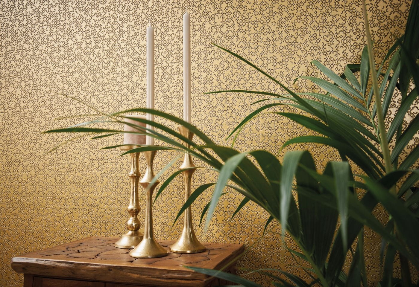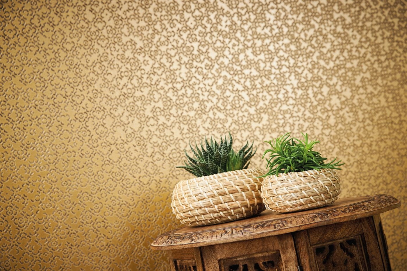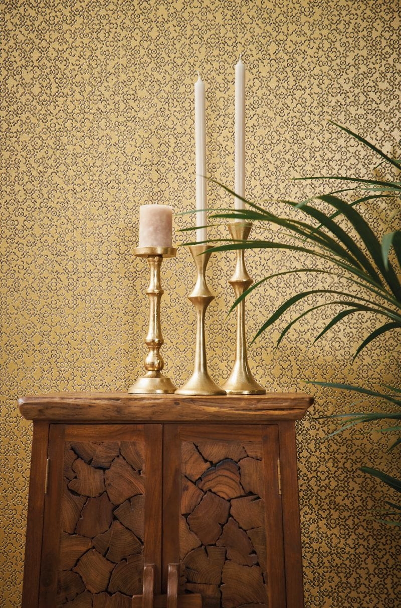 Wzór marokańskiej struktury został doskonale odzwierciedlony na winylowej tapecie ściennej na flizelinie w złotej kolorystyce