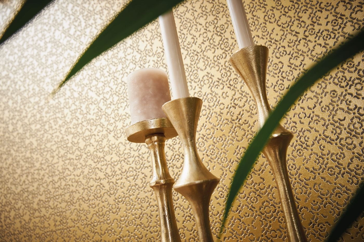 Powierzchnia tapety jest delikatnie tłoczona, szorstka w dotyku. Powierzchnia wzoru jest błyszcząca, złota a sam wzór jest delikatnie wklęsły, matowy.