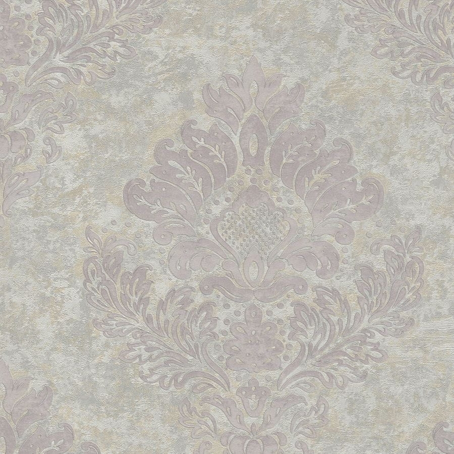Na przecieranym szaro-beżowym tle winylowej okładziny ściennej umieszczony jest duży, matowy wzór ornamentowy w szarym kolorze o delikatnym fioletowym odcieniu