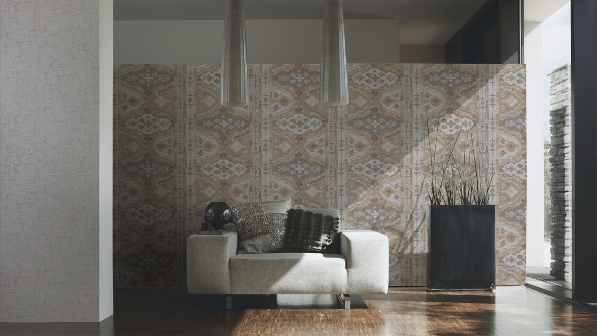 Tapeta ścienna imitująca ozdobny tynk prezentuje się dobrze zarówno w pomieszczeniach, w których spędza się większość wolnego czasu - jak salon i sypialnia, ale również w przedpokoju, czy gabinecie. Wzór jest nowoczesny, prosty i na tyle elastyczny, że na pewno sprawdzi się wszędzie, gdzie tylko go potrzebujesz.