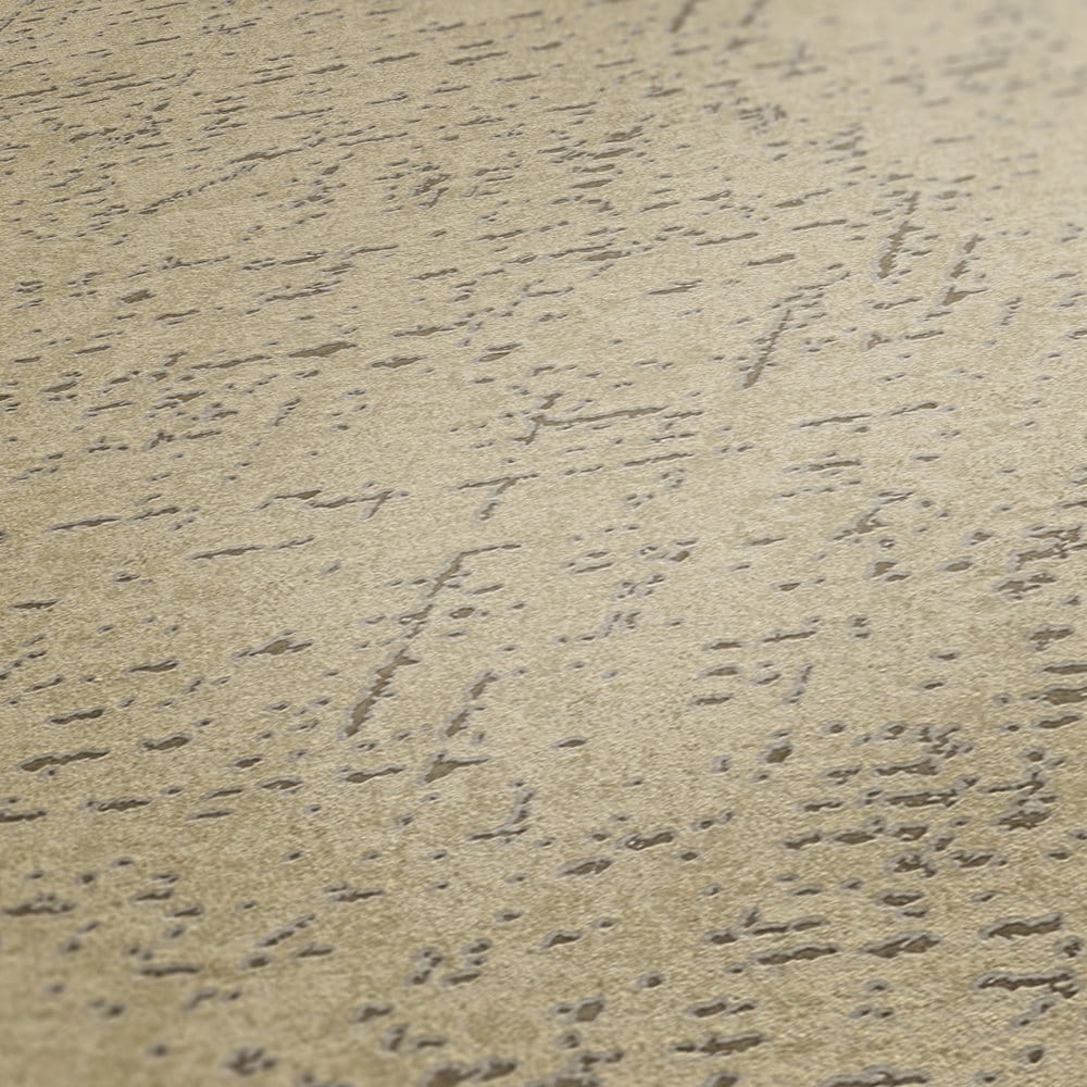 Okładzina ścienna we wzór tynku o niejednolitym beżowym kolorze o powierzchni wzoru jakby przecieranej, matowej, przez który przebija połyskujące tło w ciemnobrązowym zabarwieniu.