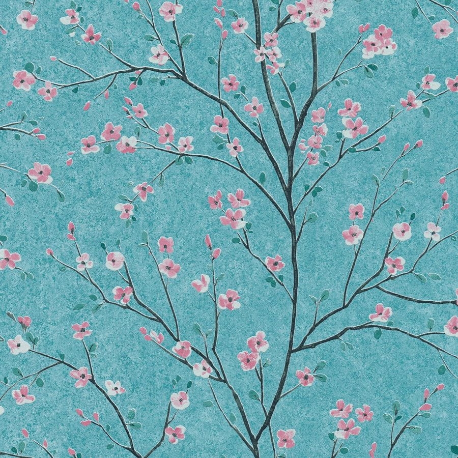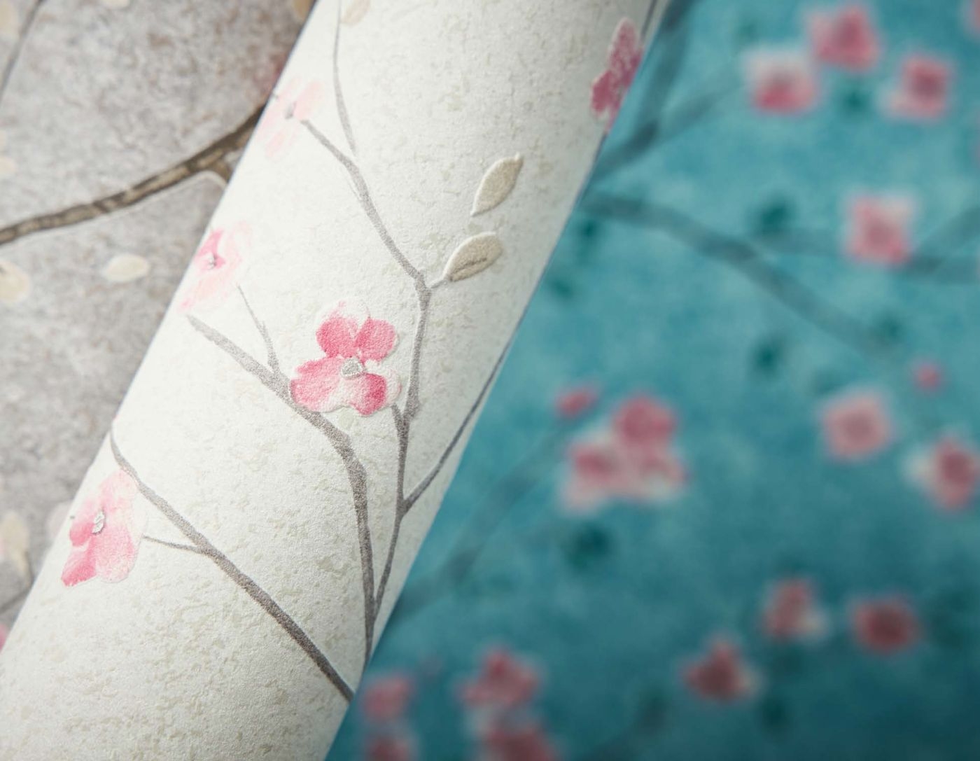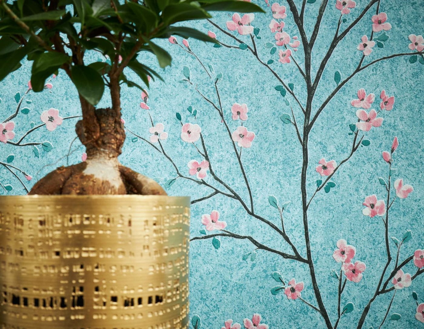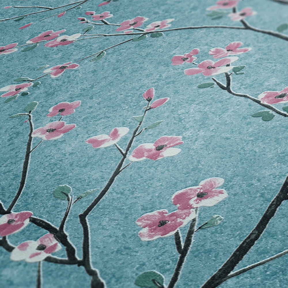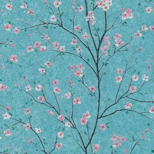 Na przecieranym, melanżowym tle, w kolorze błękitnego turkusu, winylowej okładziny ściennej umieszczony jest wzór rozłożystego drzewka w kolorze czarnym z różowymi kwiatuszkami wiśni oraz małymi, zielonymi listkami.