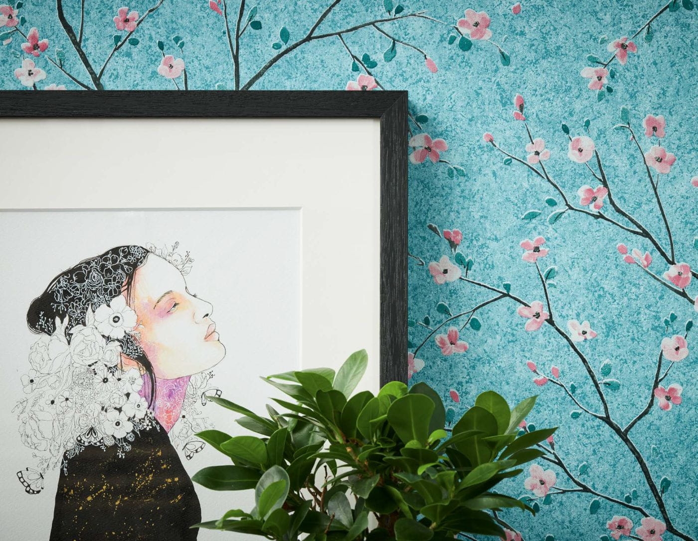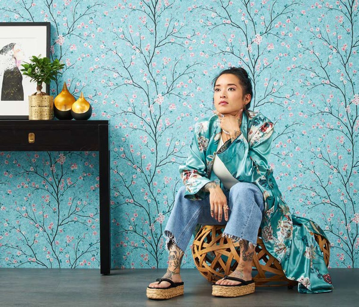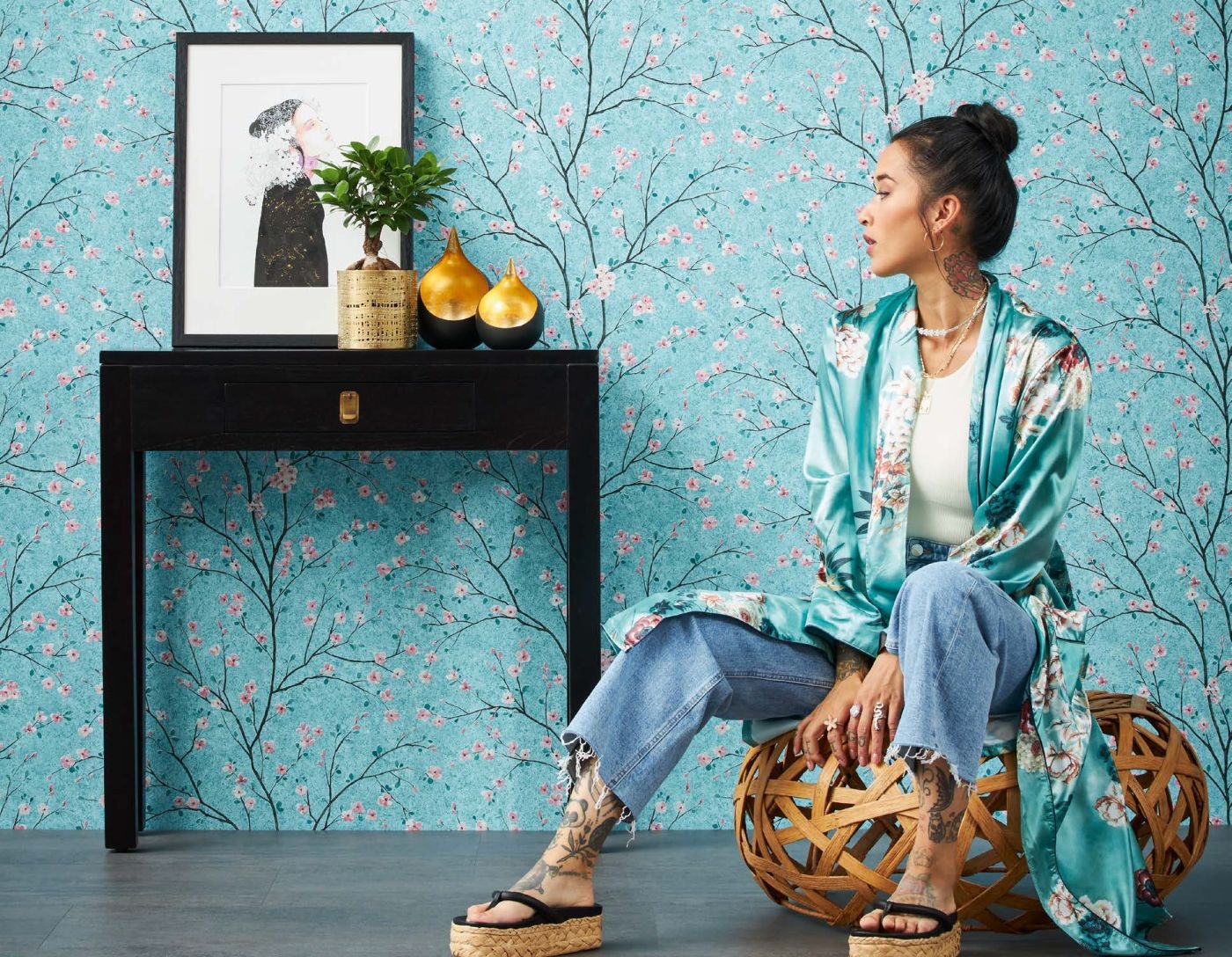 Na przecieranym, melanżowym tle, w kolorze błękitnego turkusu, winylowej okładziny ściennej umieszczony jest wzór rozłożystego drzewka w kolorze czarnym z różowymi kwiatuszkami wiśni oraz małymi, zielonymi listkami.