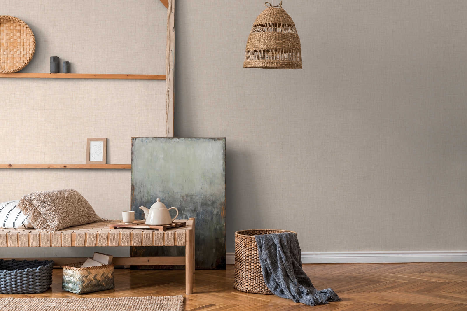 Tapeta ścienna jednokolorowa, imitująca lnianą tkaninę, materiał prezentuje się dobrze zarówno w pomieszczeniach, w których spędza się większość wolnego czasu - jak salon i sypialnia, ale również w przedpokoju, czy kuchni. Wzór jest nowoczesny, prosty i na tyle elastyczny, że na pewno sprawdzi się wszędzie, gdzie tylko go potrzebujesz.