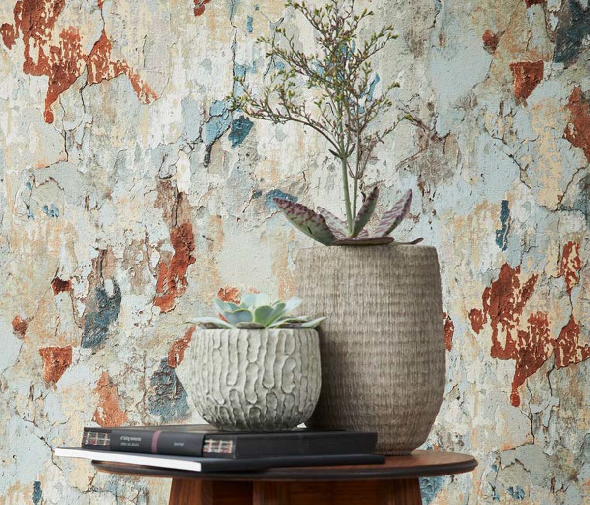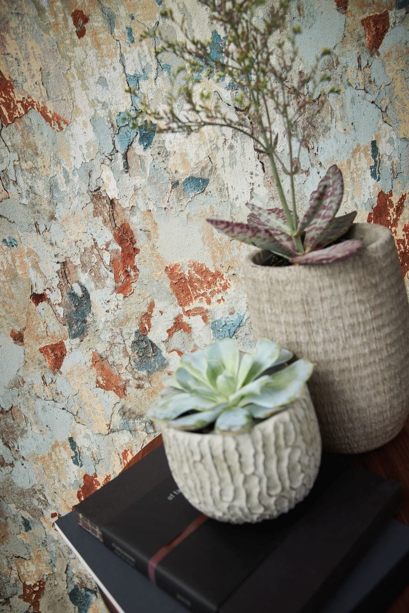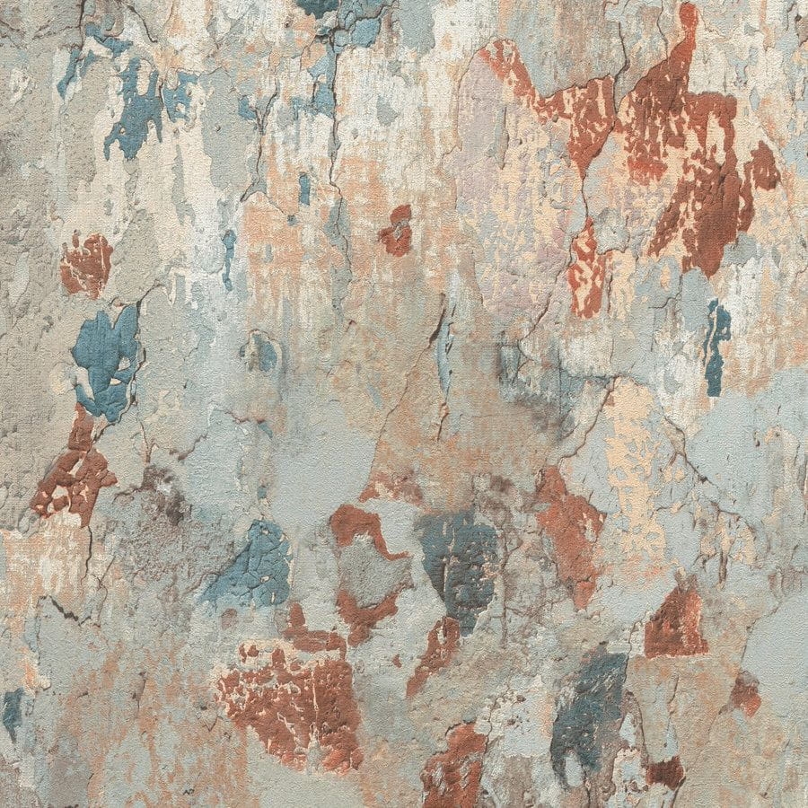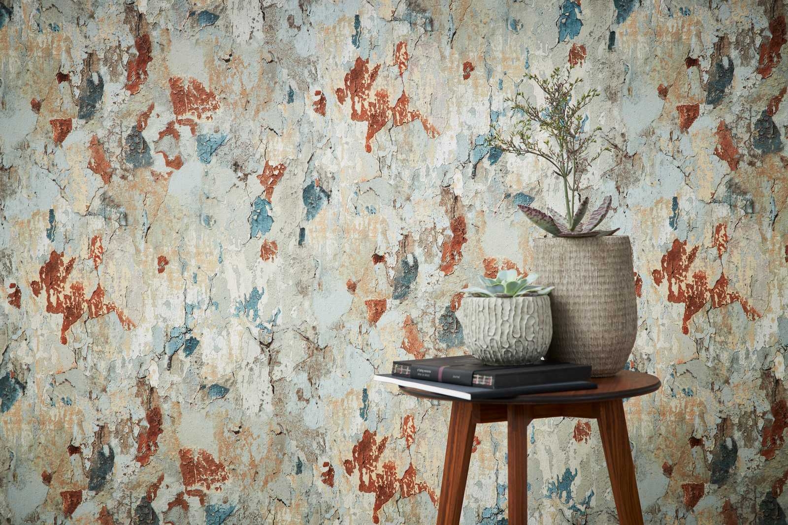 Warstwy farby w kolorach niebieski, bordowy, beżowy, szary dają wielobarwny i autentyczny efekt popękanej ściany.