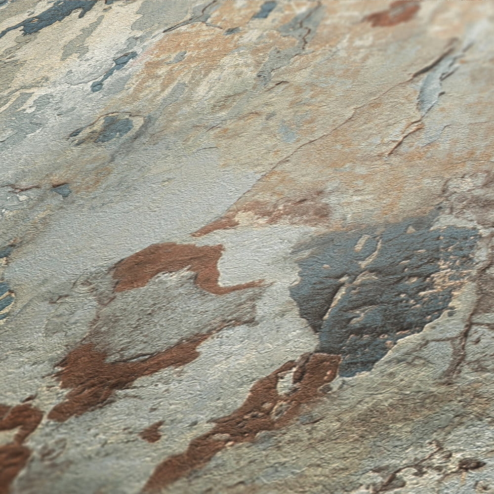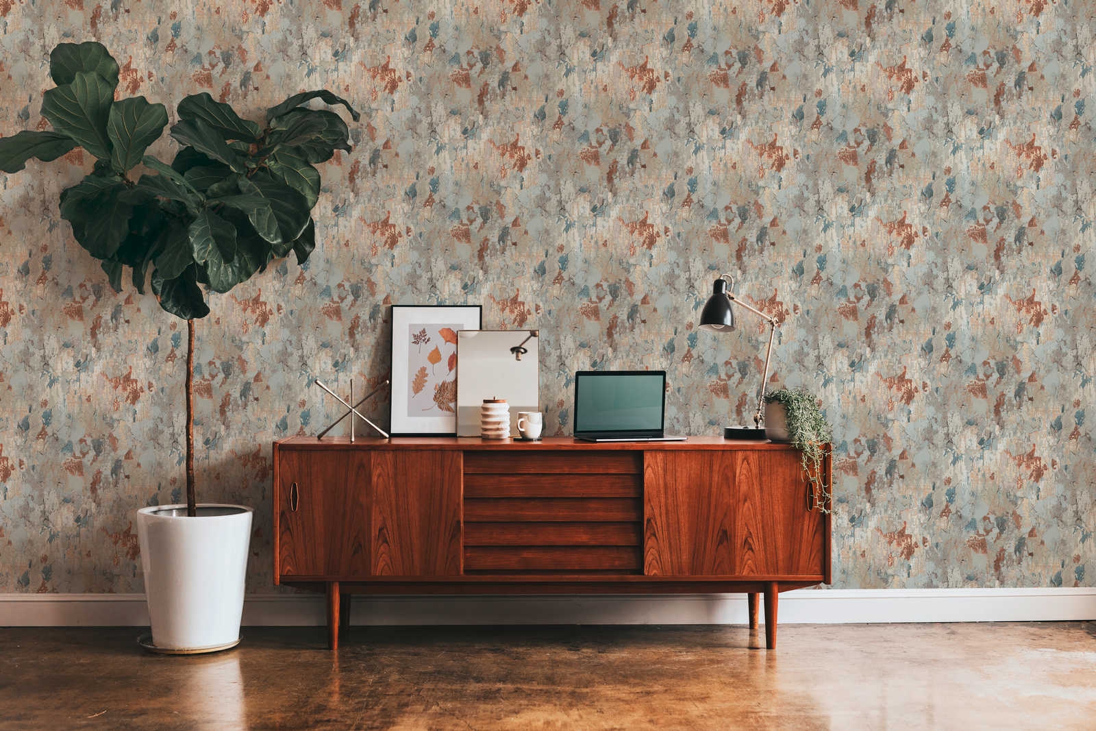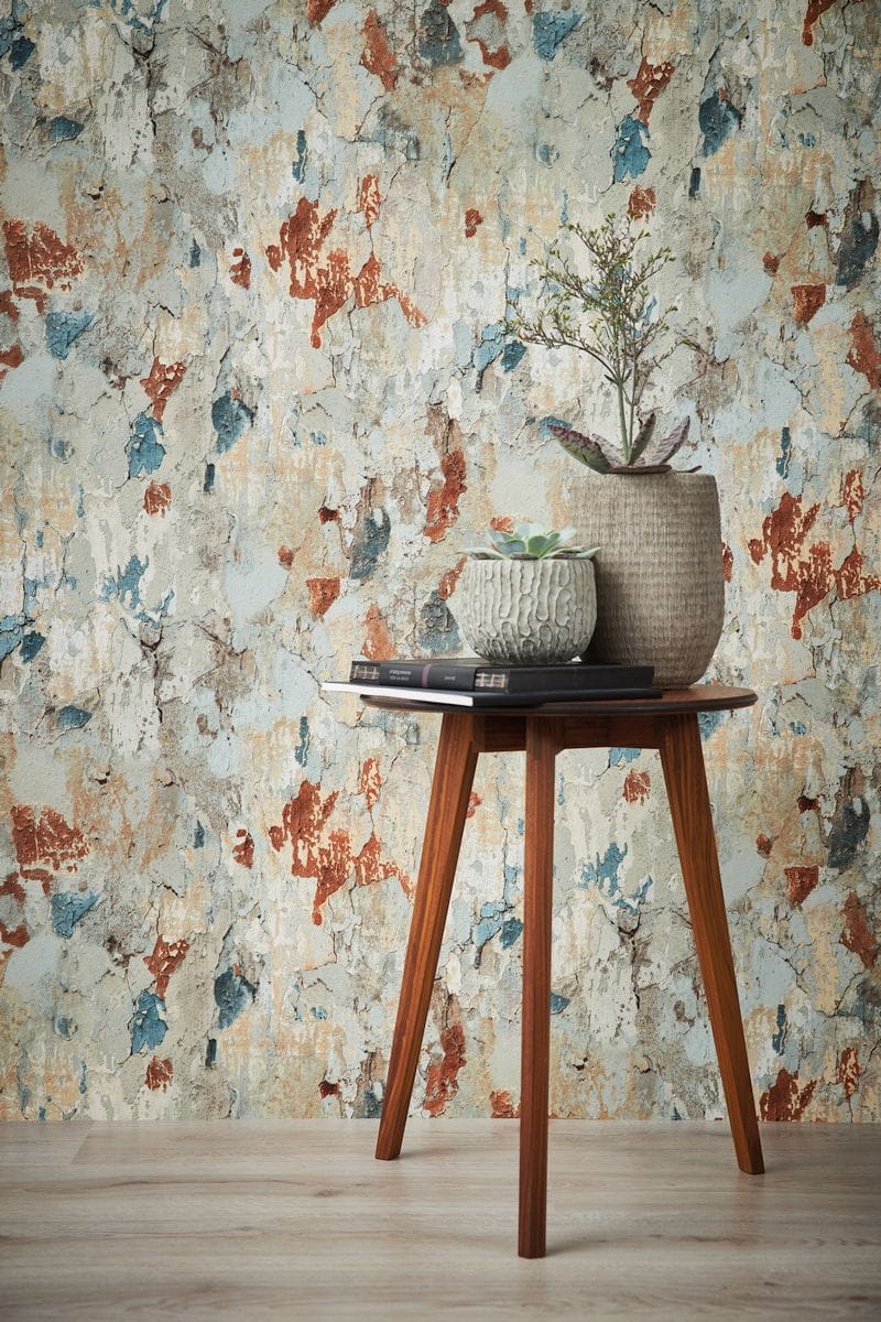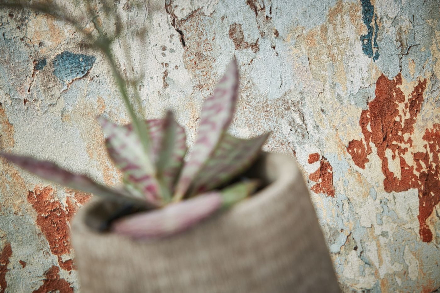 Warstwy farby w kolorach niebieski, bordowy, beżowy, szary dają wielobarwny i autentyczny efekt popękanej ściany.