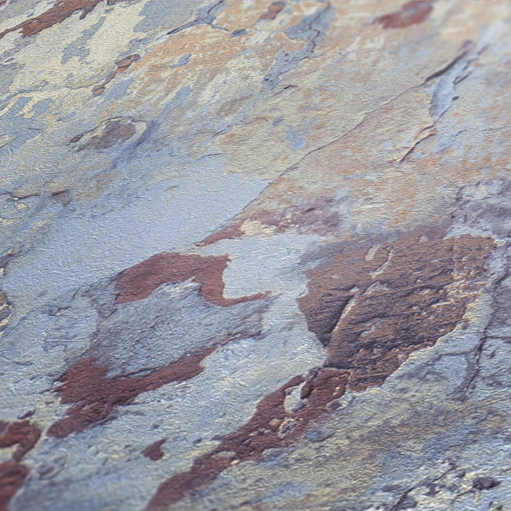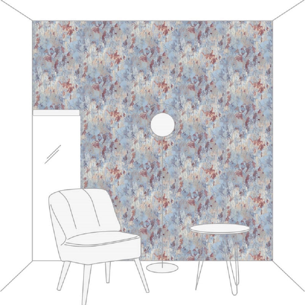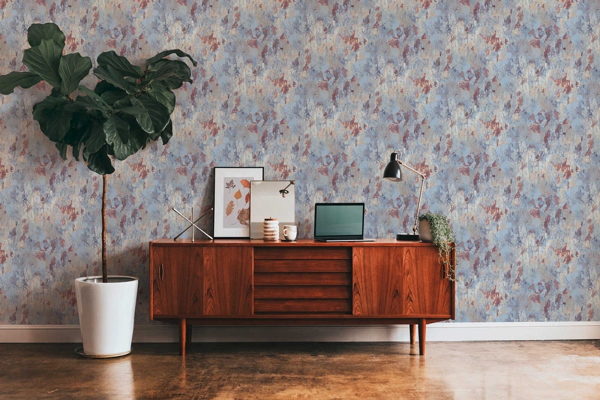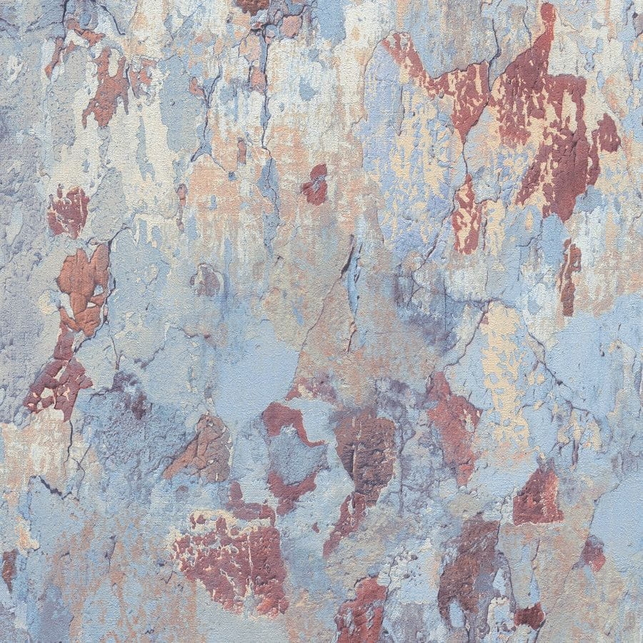 Warstwy farby w kolorach niebieski, bordowy, beżowy dają wielobarwny i autentyczny efekt popękanej ściany.