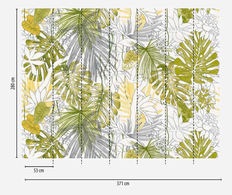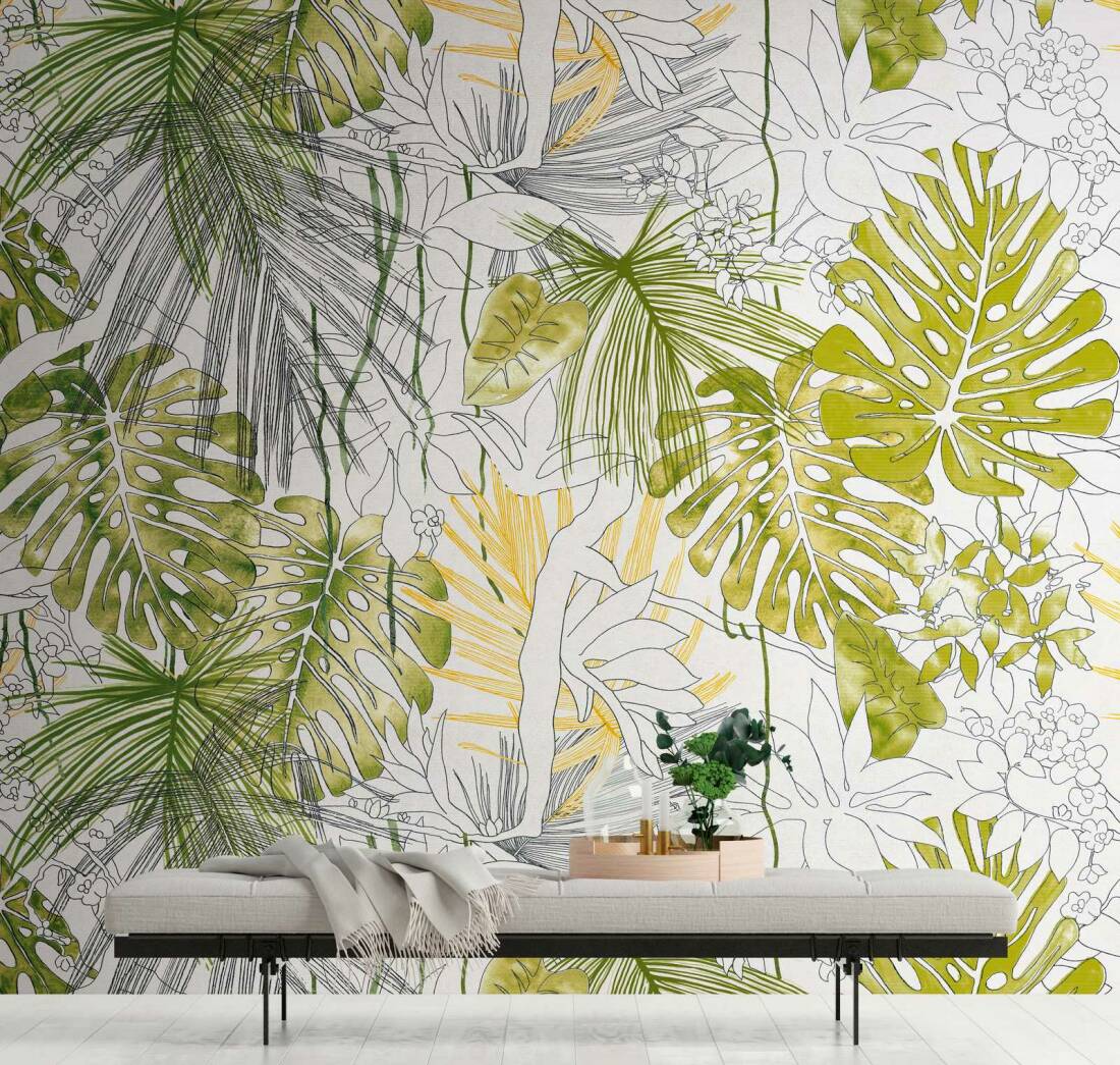 Mural ścienny na flizelinie, przedstawia liście, rośliny, monstery.