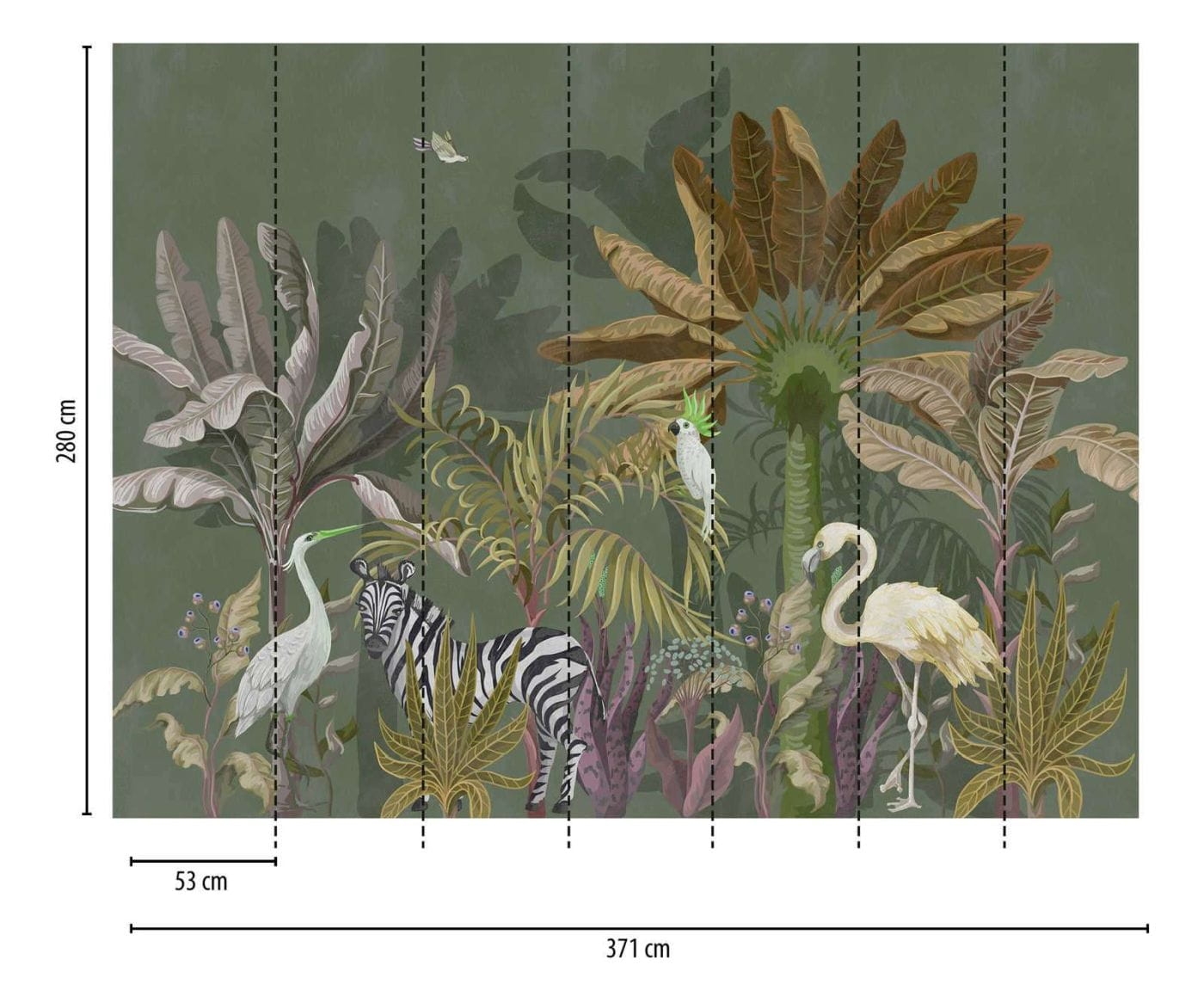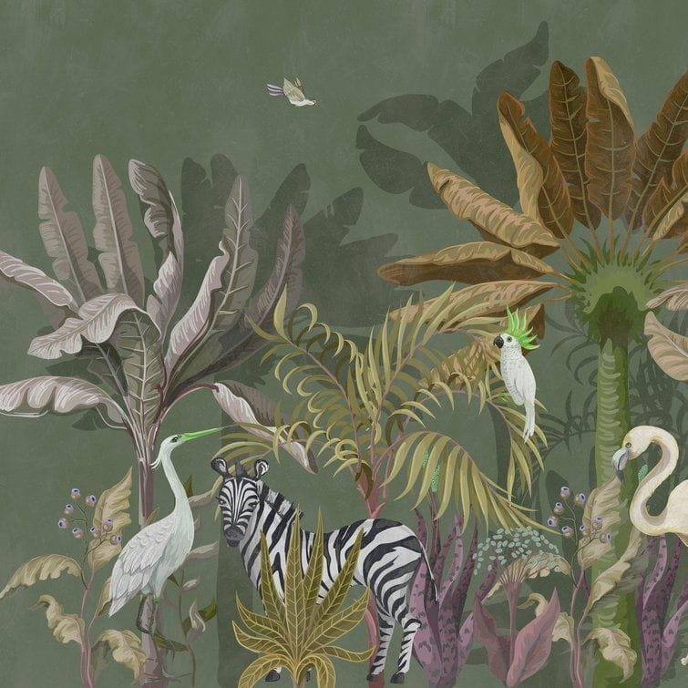 Mural ścienny na flizelinie, przedstawia rośliny, drzewa, egzotyczne zwierzęta.