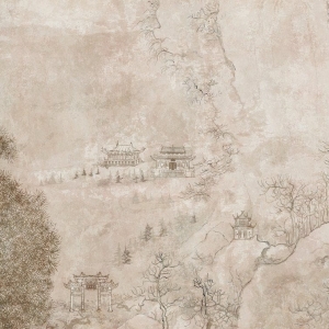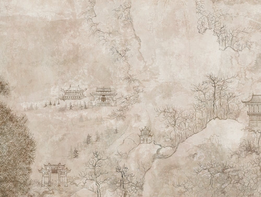 Mural ścienny na flizelinie, przedstawia pejzaż w stylu vintage, azjatyckie motywy, domki, drzewka.