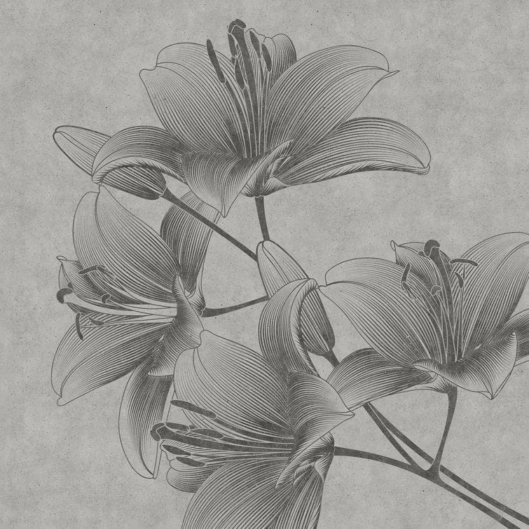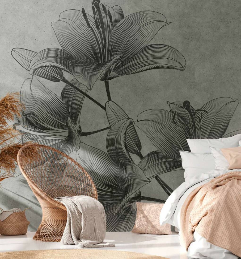 Mural ścienny na flizelinie, z motywem przedstawiającym rysunek czarnych lilii na betonowo- szarym tle.