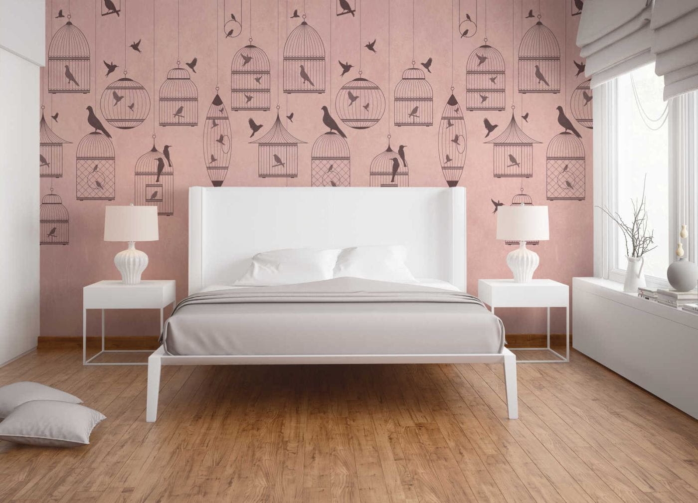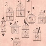 Mural ścienny na flizelinie, przedstawiający różnego kształtu, zwisające klatki z ptakami.