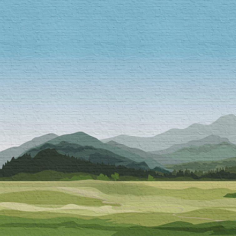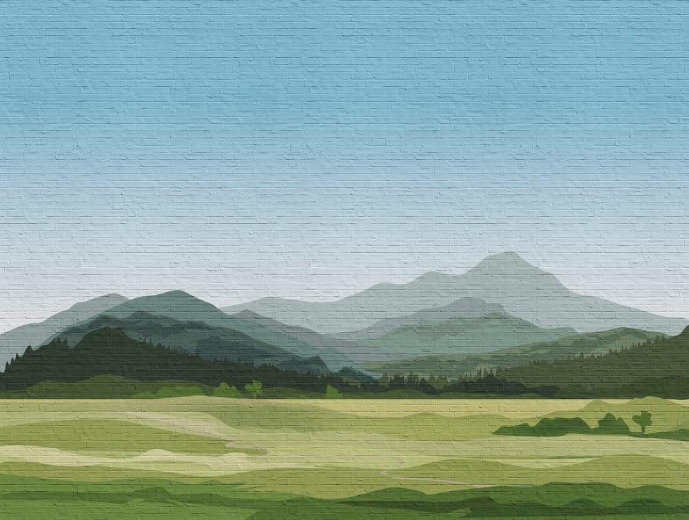Mural ścienny na flizelinie, z motywem przedstawiającym malowany pejzaż górski na tle ceglanego muru.