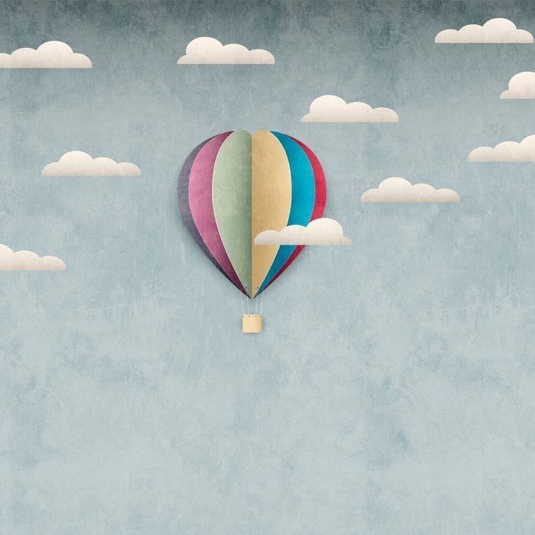 Mural ścienny na flizelinie, z motywem przedstawiającym kolorowy balon na tle nieba z białymi chmurkami.