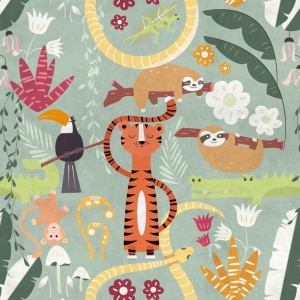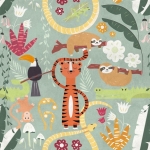 Mural ścienny na flizelinie, z motywem przedstawiającym różne kolorowe zwierzątka, rośliny, kwiatki.