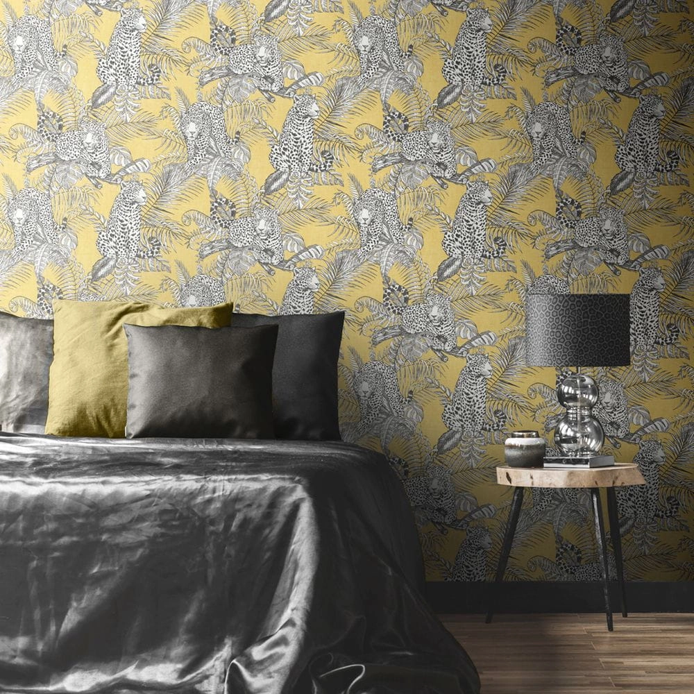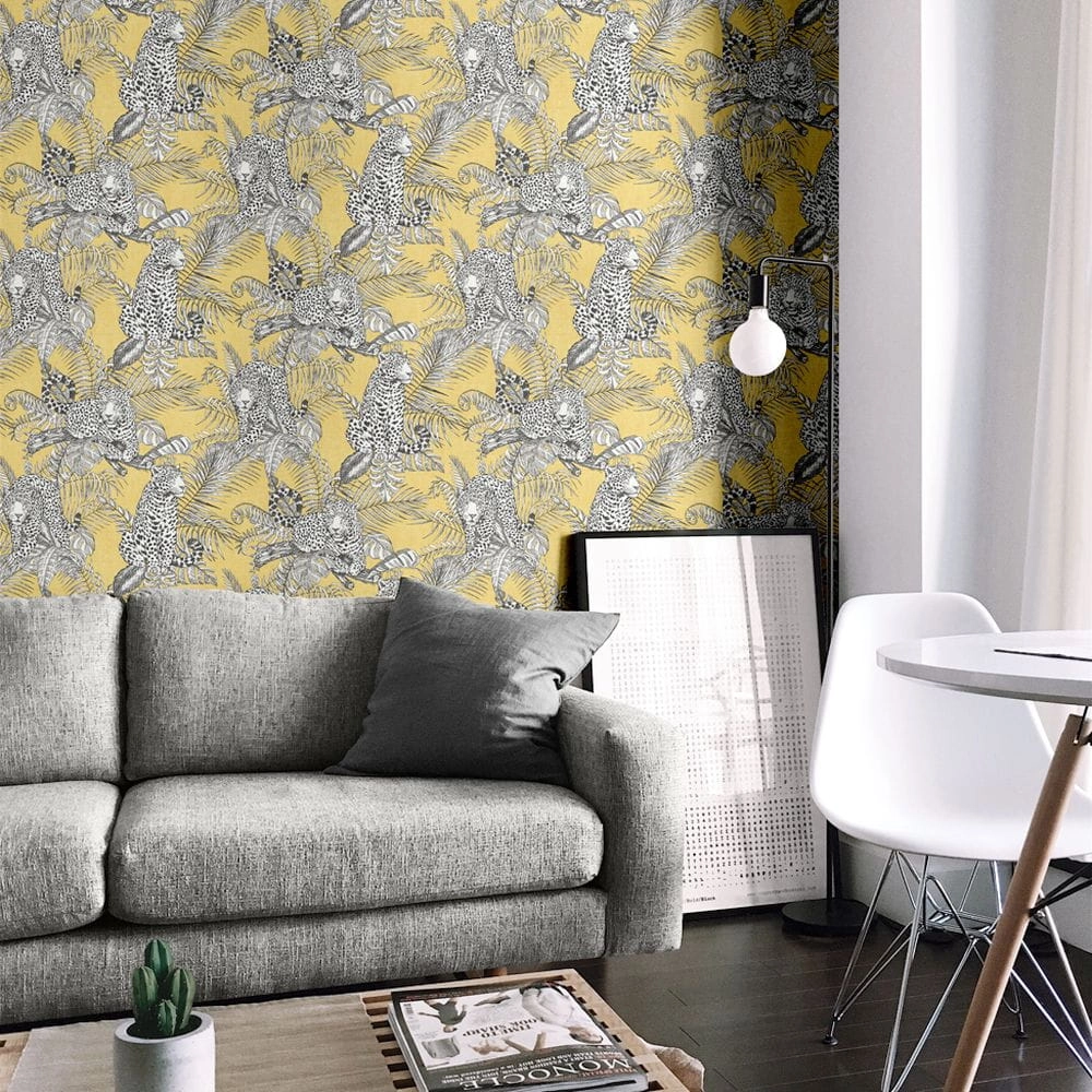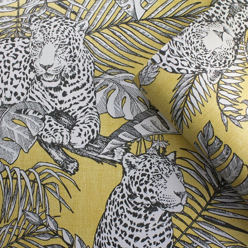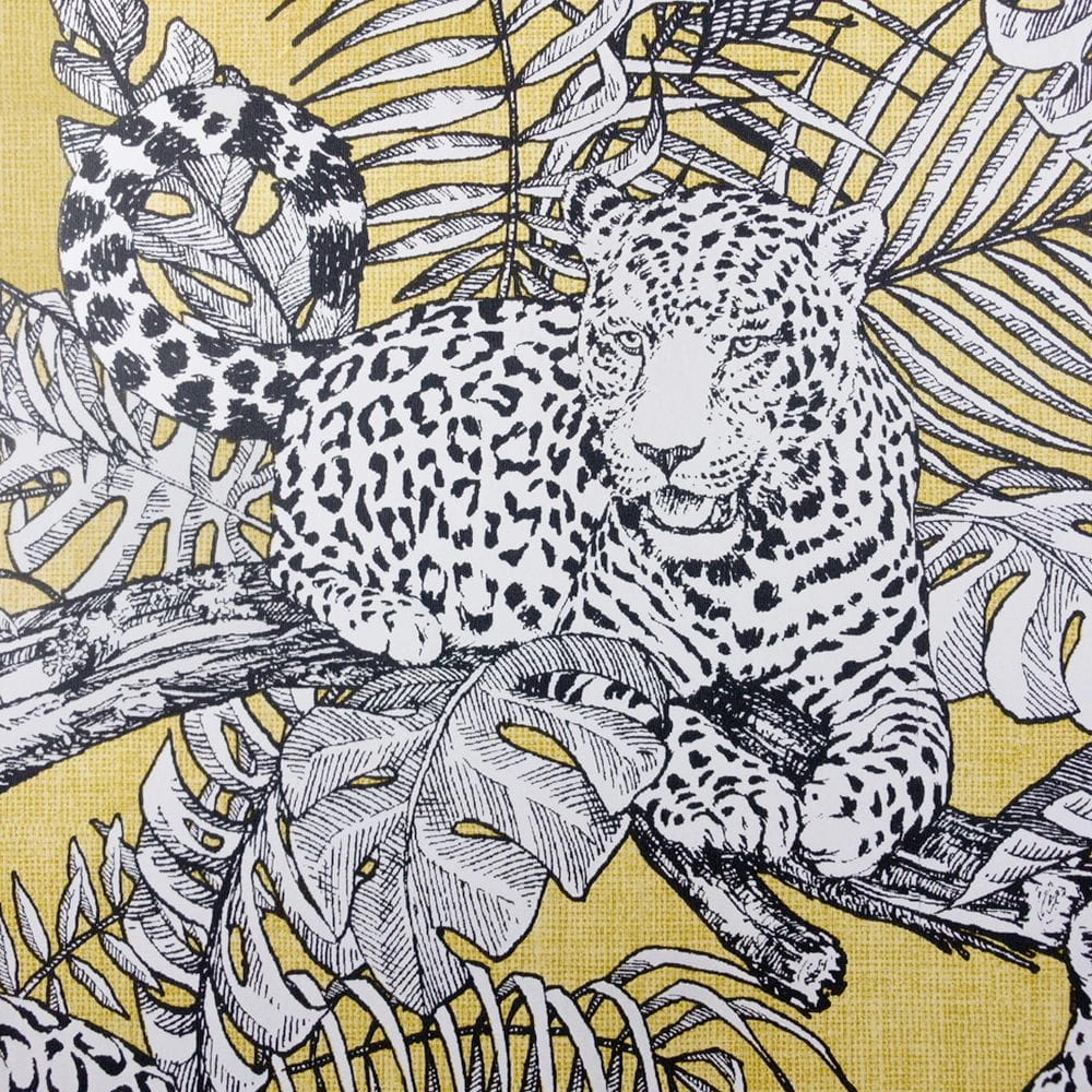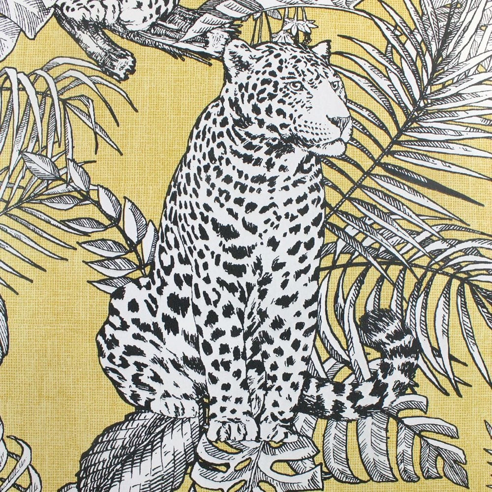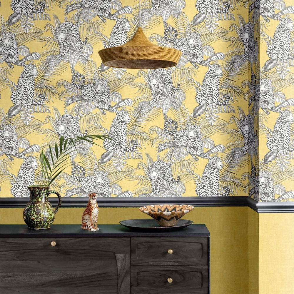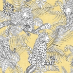Tapeta papierowa tzw. duplex, czyli podwójny papier o wzorze białych gepardów na liściastym tle. Motywy dodatkowo umiejscowione na pięknym słonecznym tle o wzorze tkaniny w odcieniach radosnego żółtego, przeplatane delikatną, lekko połyskującą, satynową nitką. Struktura tapety gładka na całej powierzchni. Wzór idealny do podkreślenia etnicznego i botanicznego charakteru wnętrza.
