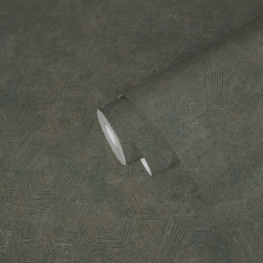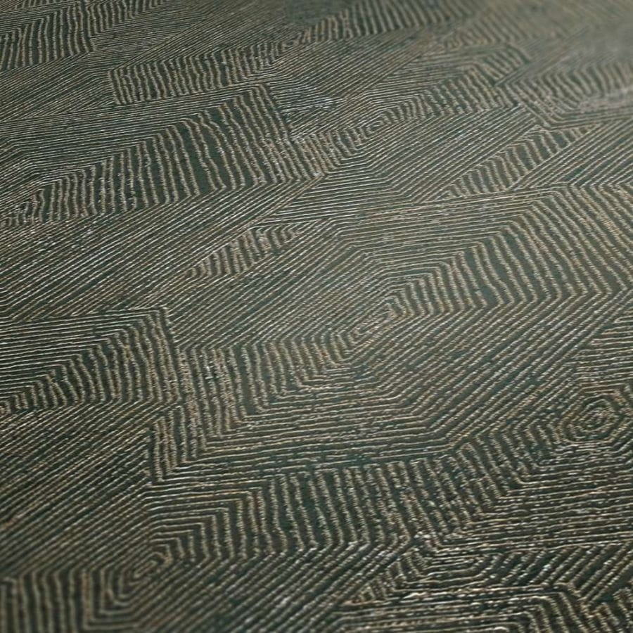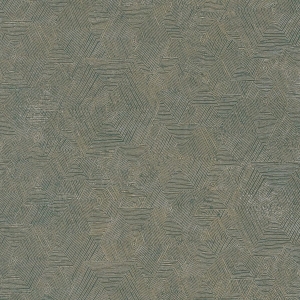 - Kolorystyka: tło tapety jest w kolorze butelkowej zieleni, wzór geometryczny jest w kolorze złotym
