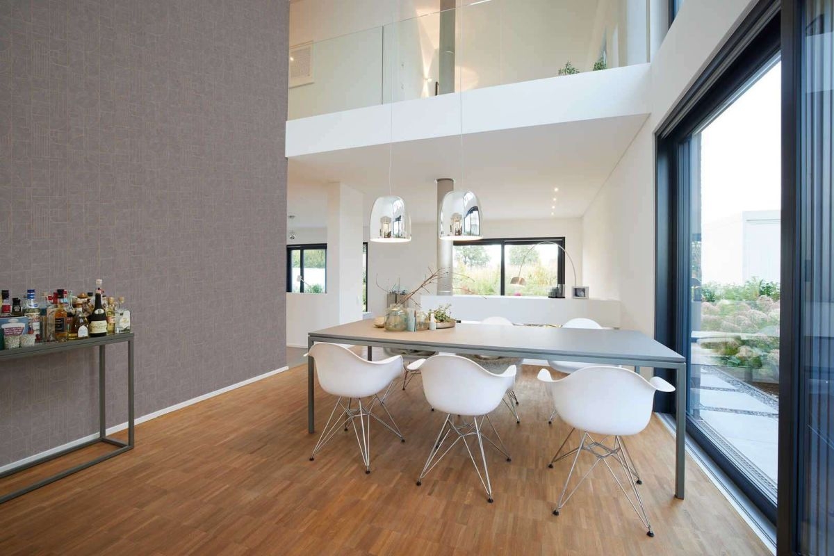 - Tapeta ścienna o dużym wzorze geometrycznym na całej powierzchni, doskonale wyeksponuje główną ścianę w pomieszczeniu.