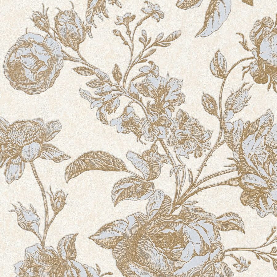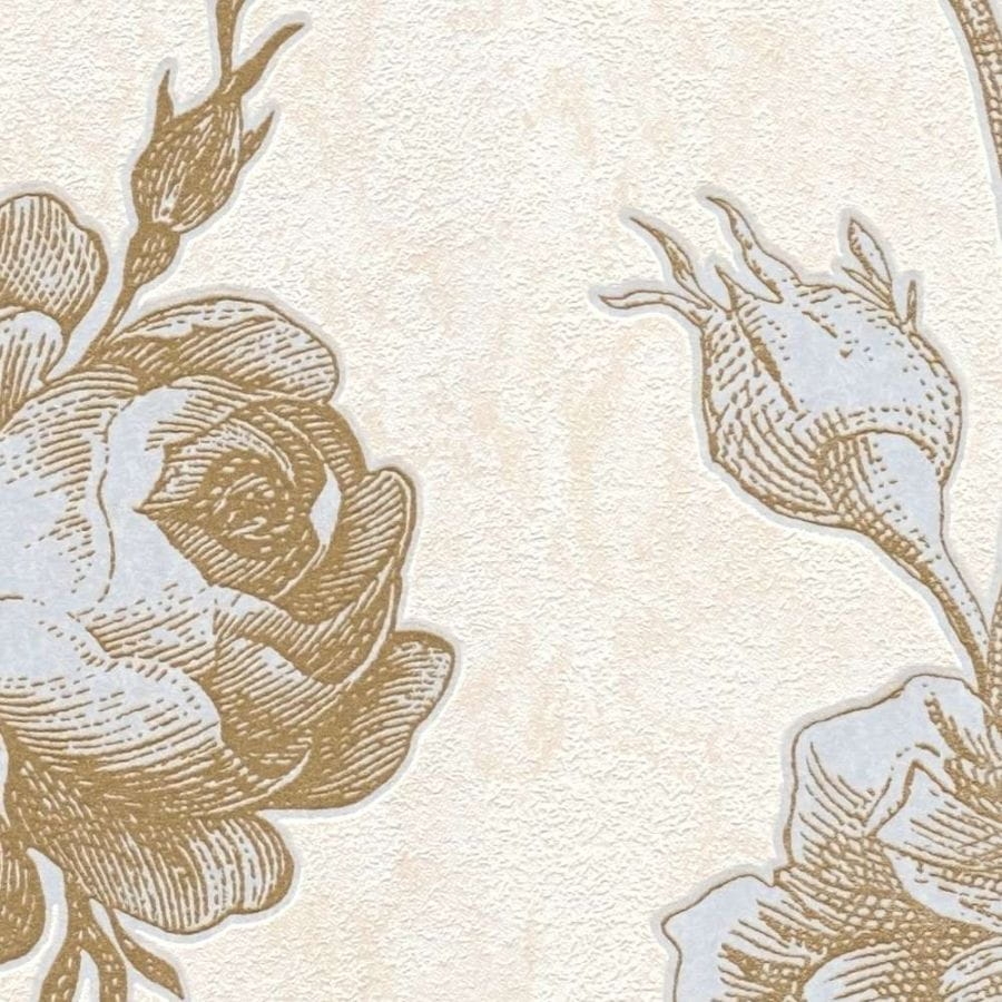 - Kolorystyka: tło tapety jest w kolorze ecru, wzór kwiatowy jest złoty