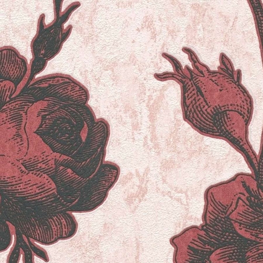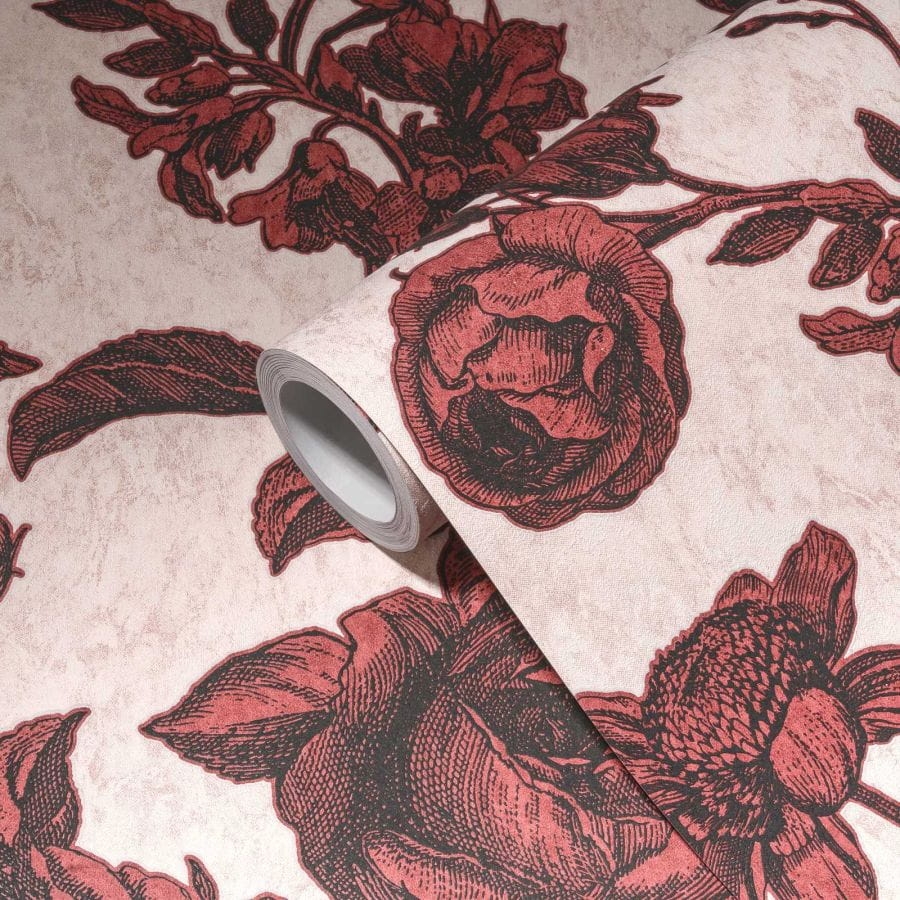 - Kolorystyka: tło tapety jest w kolorze pudrowego różu, wzór kwiatowy jest czarno - bordowy