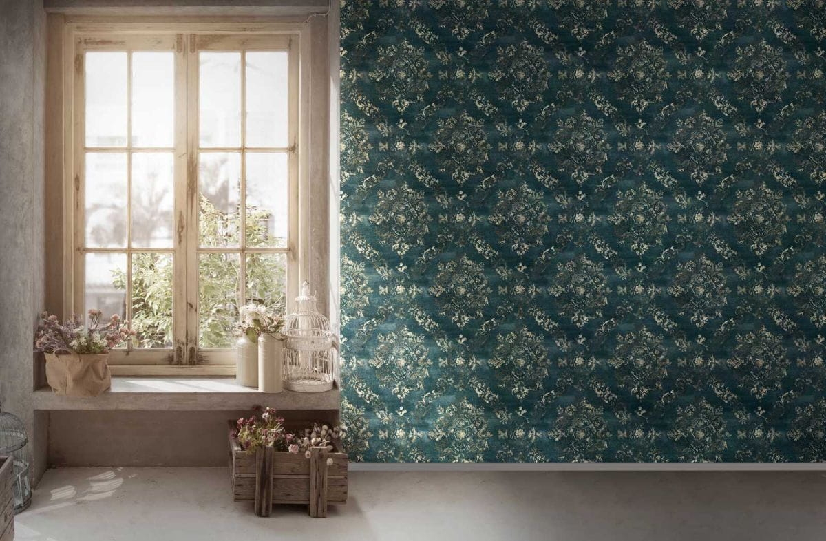 - Kolorystyka: kolor turkusowy przecierany, matowy,niejednolity, na kształt zacieranego tynku. Wzór bogaty, połyskujący, złoty