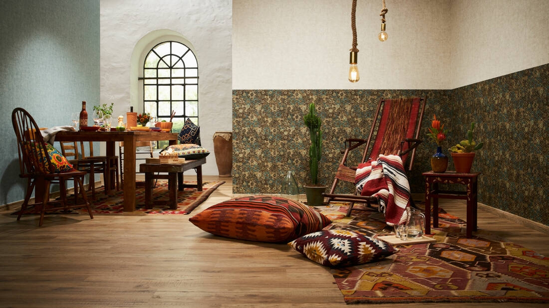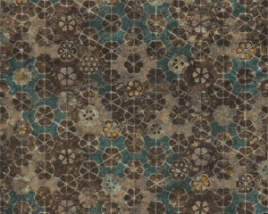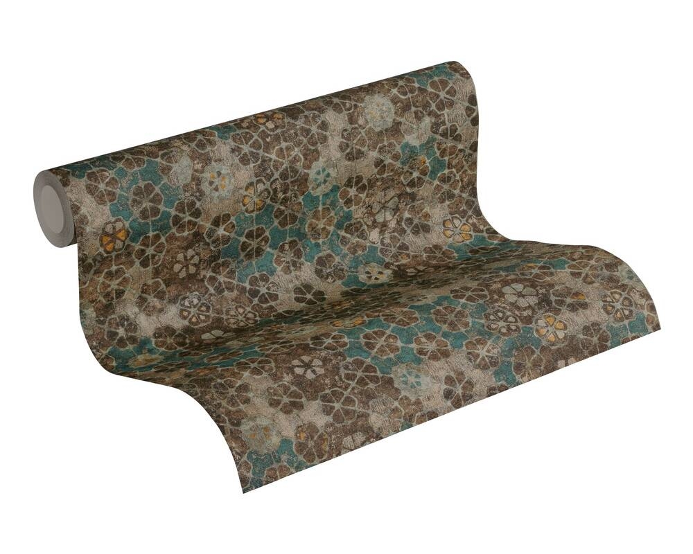 Ten wzór znajduje uznanie wśród osób, które cenią sobie oryginalne i ciekawe pomysły i nie boją się odważnych aranżacji. Struktura tapety lekko chropowata, ziarnista w dotyku. Delikatne i niewielkie kwiaty, które zostały umieszczone na tapecie są na tle delikatnego motywu graficznego. Całość wyraźnie przecierana, cieniowana, różne odcienie brązu, beżu, zieleni, turkusu i pomarańczowego, umiejętnie łączą się ze sobą tworząc niezwykle ciekawą aranżację, która sprawia wrażenie "dotkniętej zębem czasu". Symetryczne rozmieszczenie tych kwiatów powoduje, że kompozycja wydaje się spokojna i stonowana, dzięki czemu milej spędza się czas w takim otoczeniu. Delikatne metaliczne efekty sprawiają, że wzór staje się niezwykle efektowny i z pewnością podkreśli każdy wystrój.