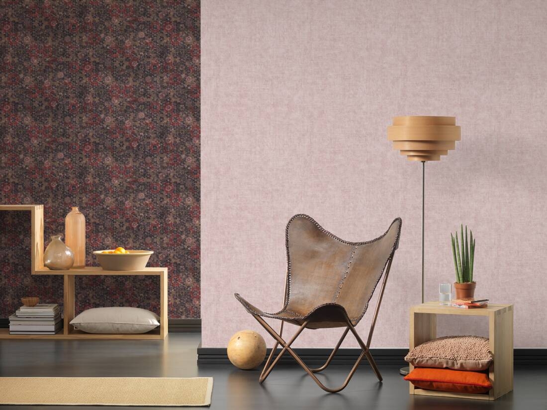 Ten wzór znajduje uznanie wśród osób, które cenią sobie oryginalne i ciekawe pomysły i nie boją się odważnych aranżacji. Struktura tapety lekko chropowata, ziarnista w dotyku. Delikatne i niewielkie kwiaty, które zostały umieszczone na tapecie są na tle delikatnego motywu graficznego. Całość wyraźnie przecierana, cieniowana, różne odcienie brązu, czerwieni, delikatnego różu, beżu, metalicznego złota, umiejętnie łączą się ze sobą tworząc niezwykle ciekawą aranżację, która sprawia wrażenie "dotkniętej zębem czasu". Symetryczne rozmieszczenie tych kwiatów powoduje, że kompozycja wydaje się spokojna i stonowana, dzięki czemu milej spędza się czas w takim otoczeniu. Delikatne metaliczne efekty sprawiają, że wzór staje się niezwykle efektowny i z pewnością podkreśli każdy wystrój.