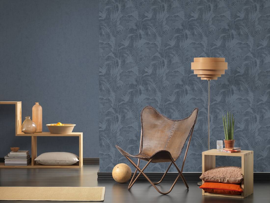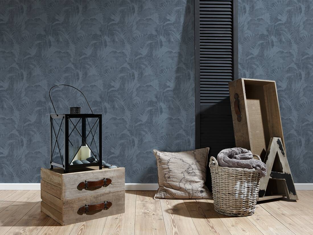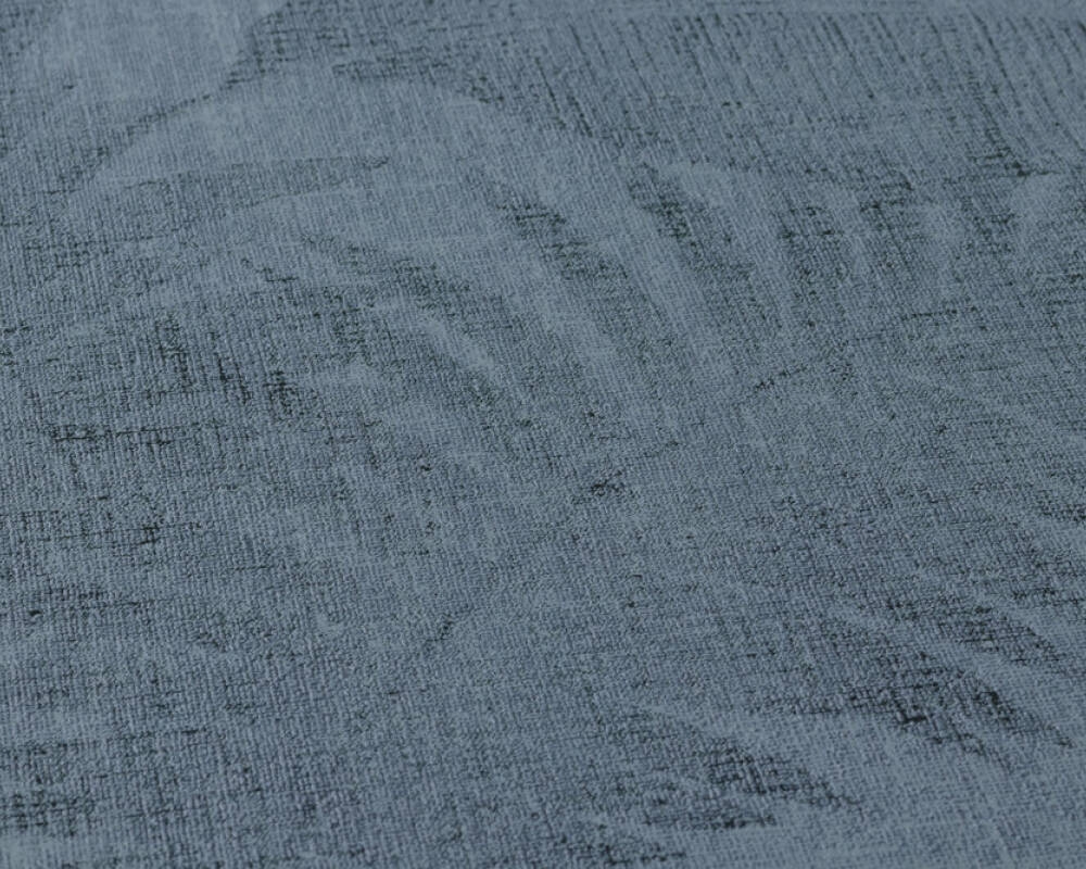 Ten wzór tapety znajdzie uznanie u wszystkich, którzy cenią sobie styl botaniczny z naturą w tle. Faktura tapety lekko chropowata w dotyku, nakrapiana. Kolor niejednolity, przecierany tworzy na tapecie tło imitujące powierzchnię lnianej tkaniny. Całość zaś wypełniają duże liście różnego rodzaju i formy, jednak kompozycja jest bardzo delikatna i stonowana, ponieważ gęstwina liści jest w formie delikatnego nadruku na tapecie. Aranżacja jest wykonana w stonowanej kolorystyce: tło w odcieniu delikatnego, nieco zgaszonego niebieskiego, na nim ciemniejsze liście, delikatnie wpadające w szarość. Kompozycja jest spokojna i stonowana, dzięki czemu milej spędza się czas w takim otoczeniu.