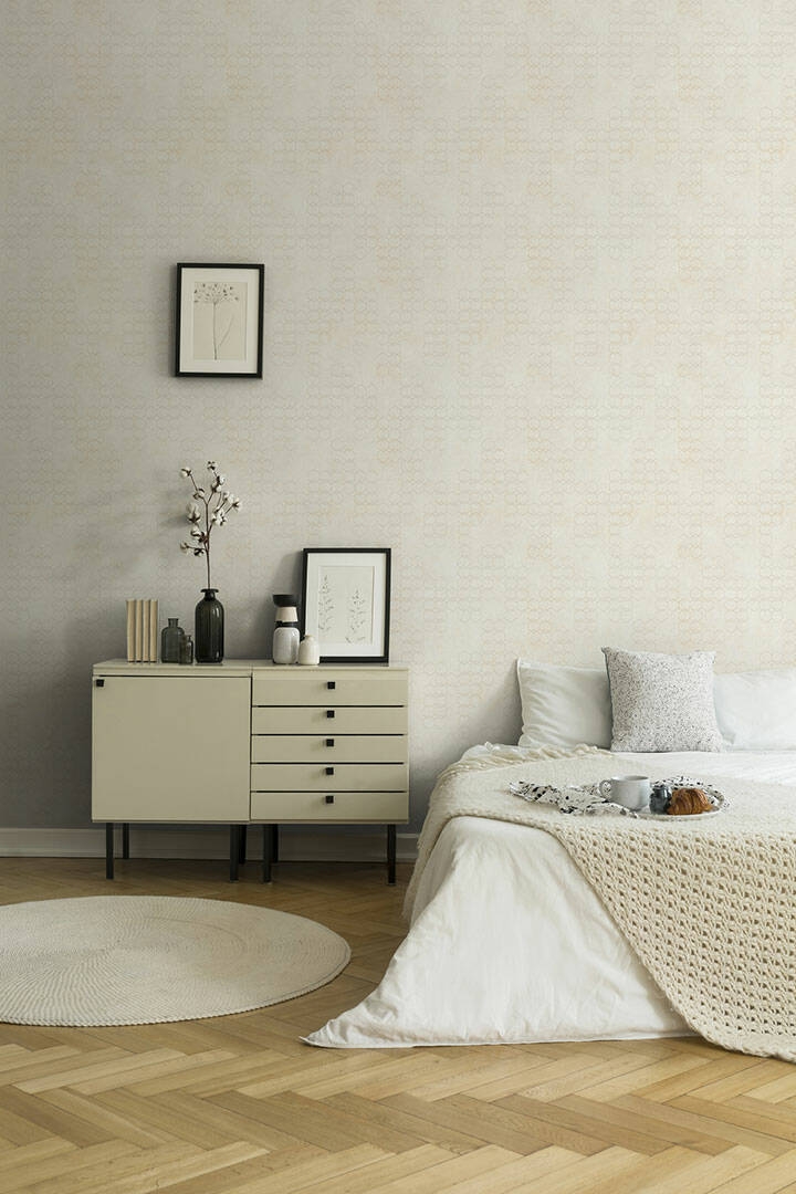 Tapeta w tynk przecierana biało-perłowy ze wzorami geometrycznymi w kolorze perłowym