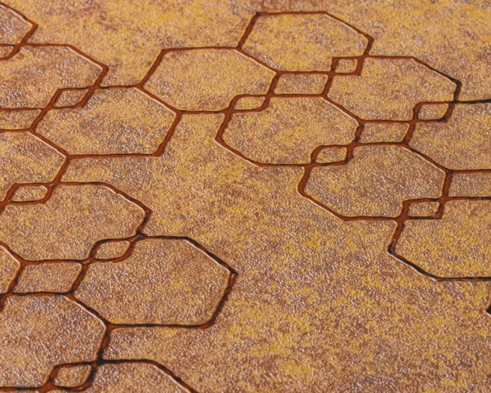 Tapeta w tynk przecierana brązowo-pomarańczowy ze wzorami geometrycznymi w rdzawym kolorze