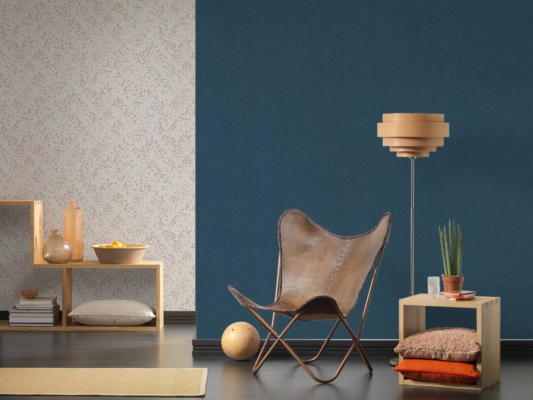 Ten wzór znajdzie uznanie wśród osób, które cenią sobie proste i naturalne pomysły w wykończeniu wnętrz. Tapeta o matowej powierzchni, jest delikatnie chropowata w dotyku o jednolitej fakturze. Kolor nie jest jednolity, delikatnie przecierany, widoczne są różne odcienie granatowego i ciemnoniebieskiego, dzięki temu na powierzchni tapety tworzy się wzór przypominający lnianą tkaninę. Prosta, a zarazem ciekawa aranżacja, będzie doskonałym tłem do wzorzystych tapet, lub pasujących elementów dekoracji.