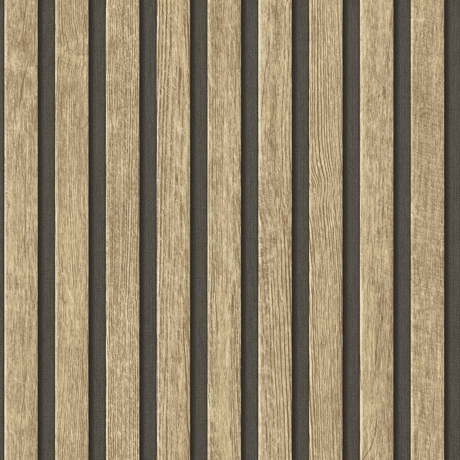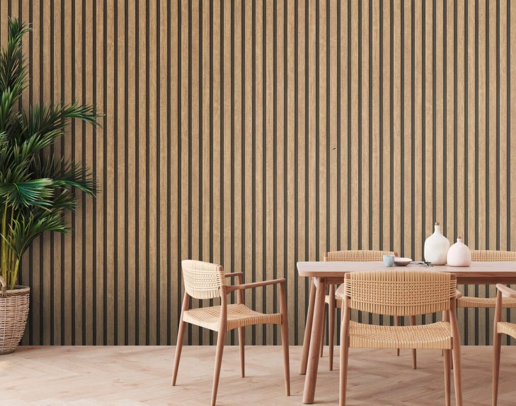 Tapeta idealnie imituje naturalną ściankę z paneli lamelowych. Ze względu na mocną i trwałą powłokę winylową, nadaje się doskonale do salonu, pokoju, przedpokoju, jadalni czy kuchni.