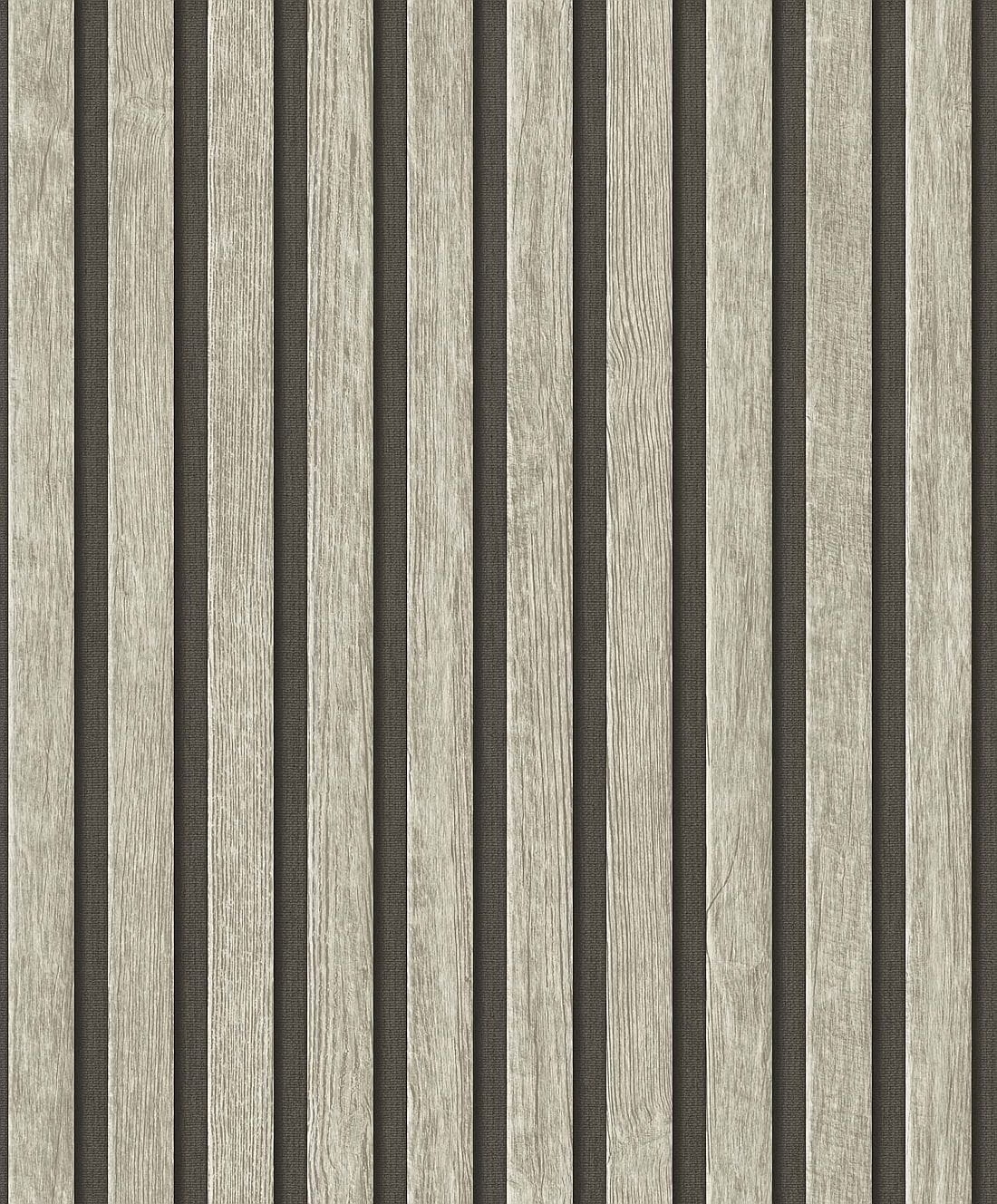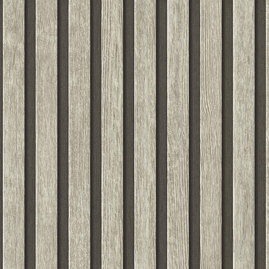Tapeta imitująca naturalne, drewniane lamele w szarobrązowym odcieniu.