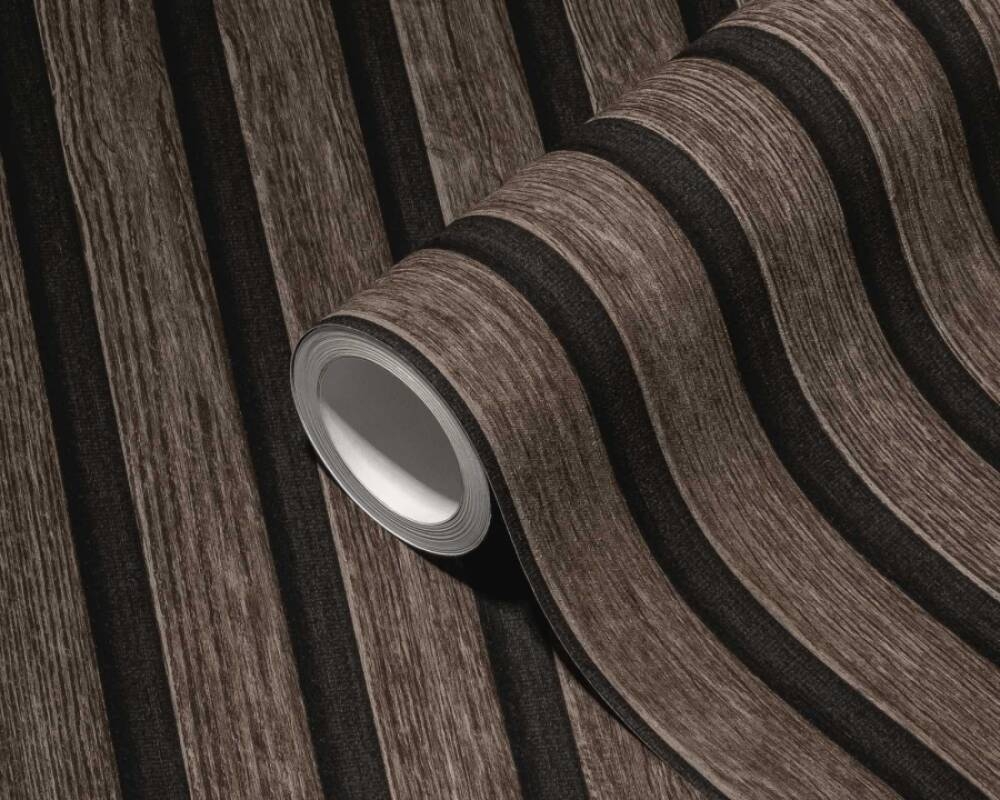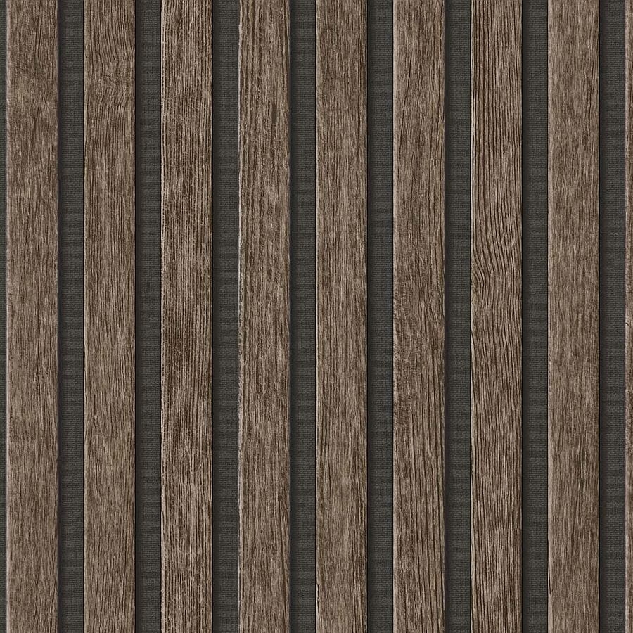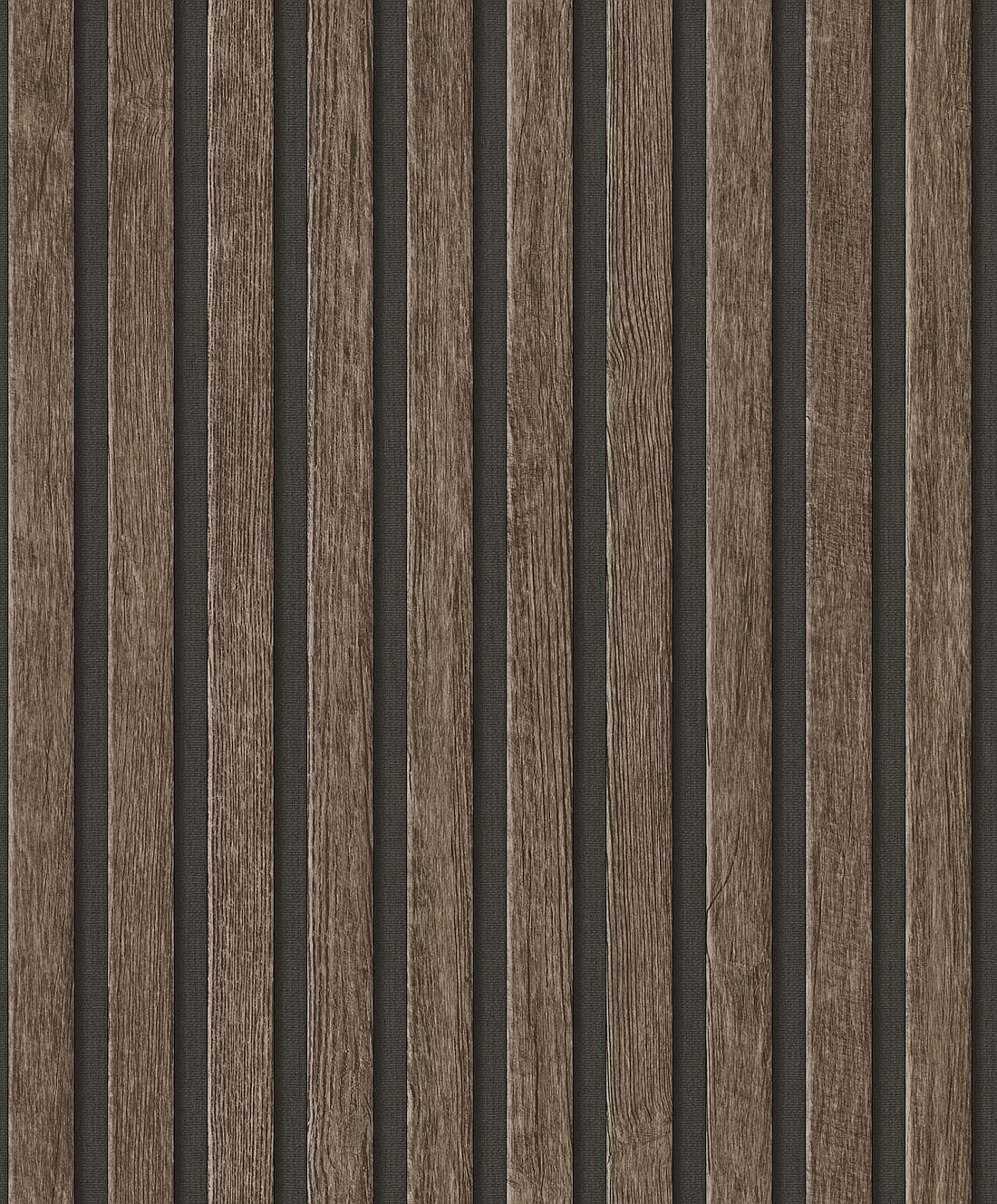 Tapeta imitująca naturalne, drewniane lamele w brązowym odcieniu.